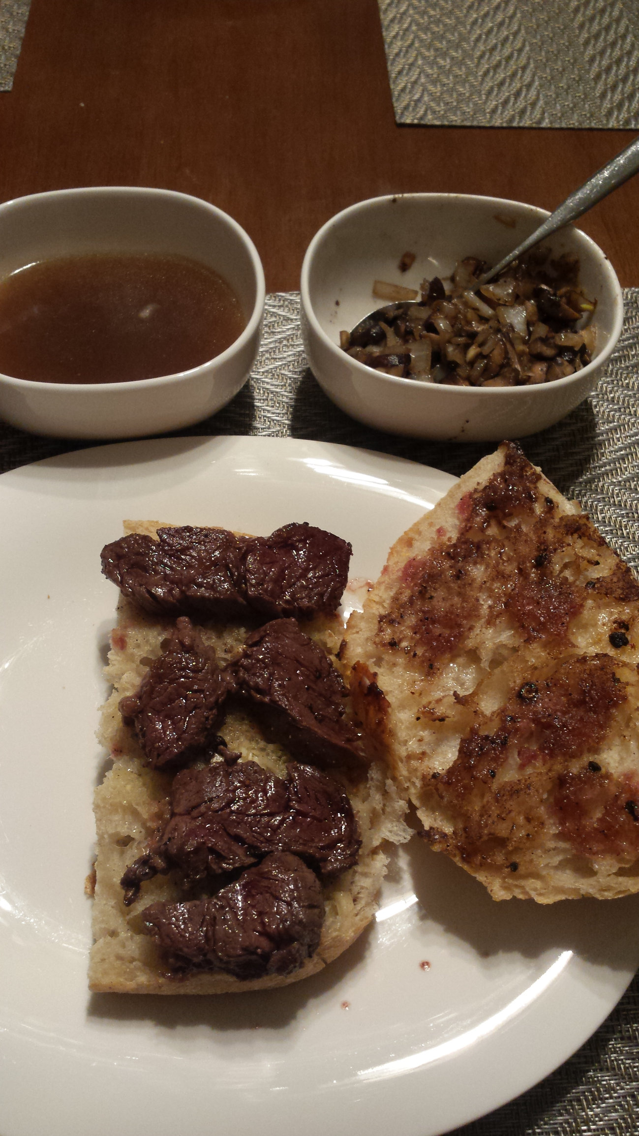 (old picture of hanger steak on homemade ciabatta with mushrooms and "au juice")