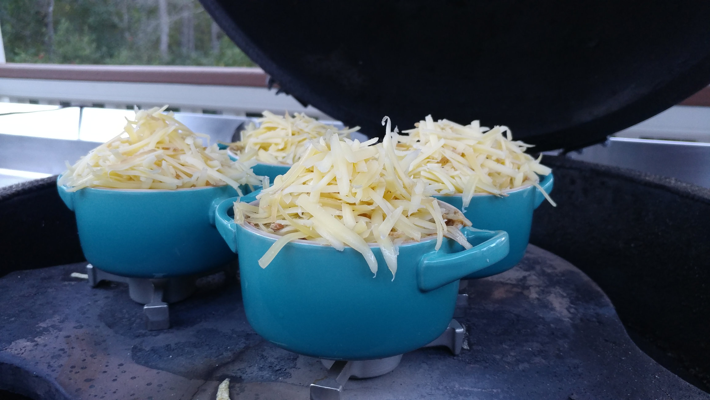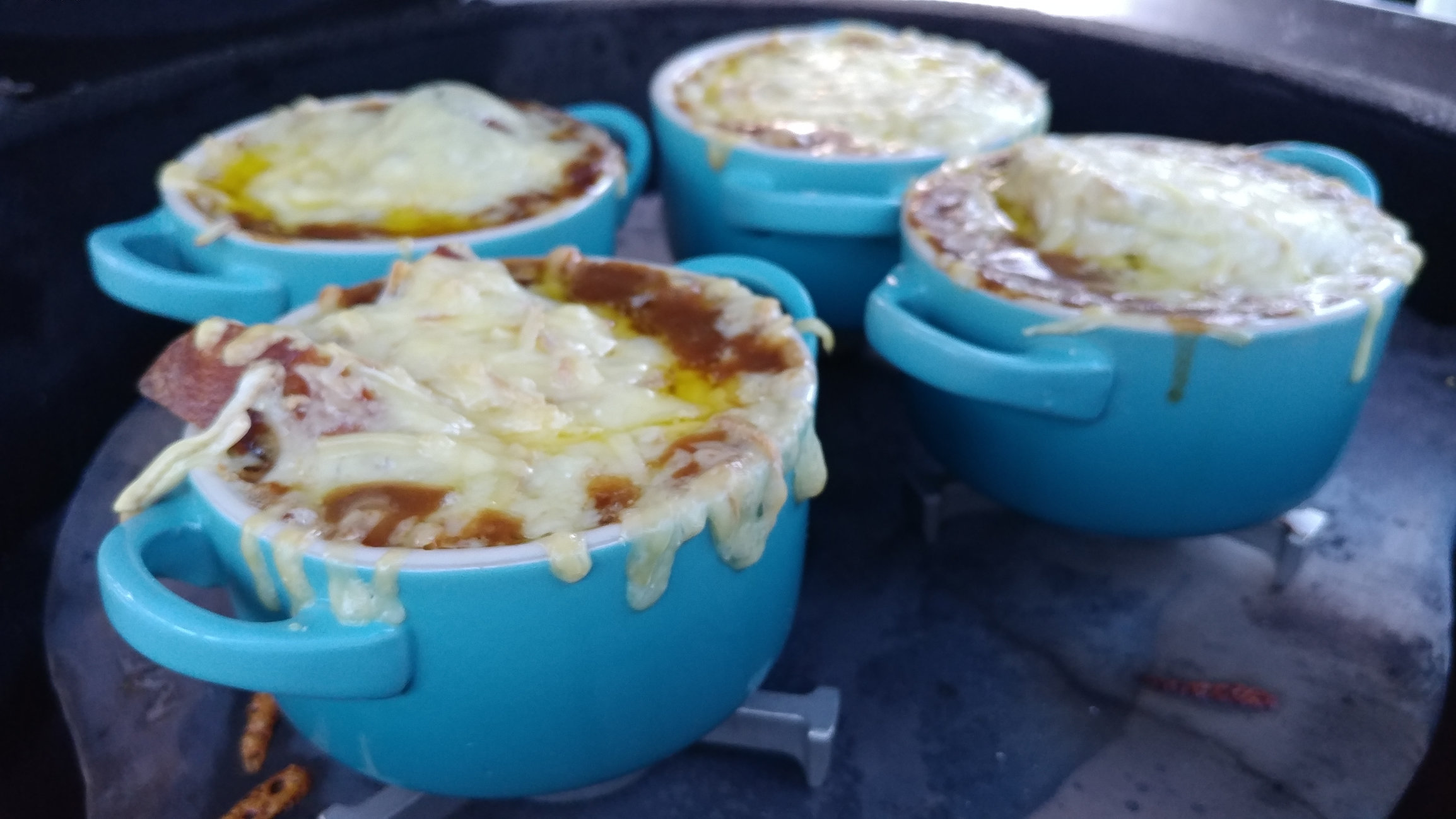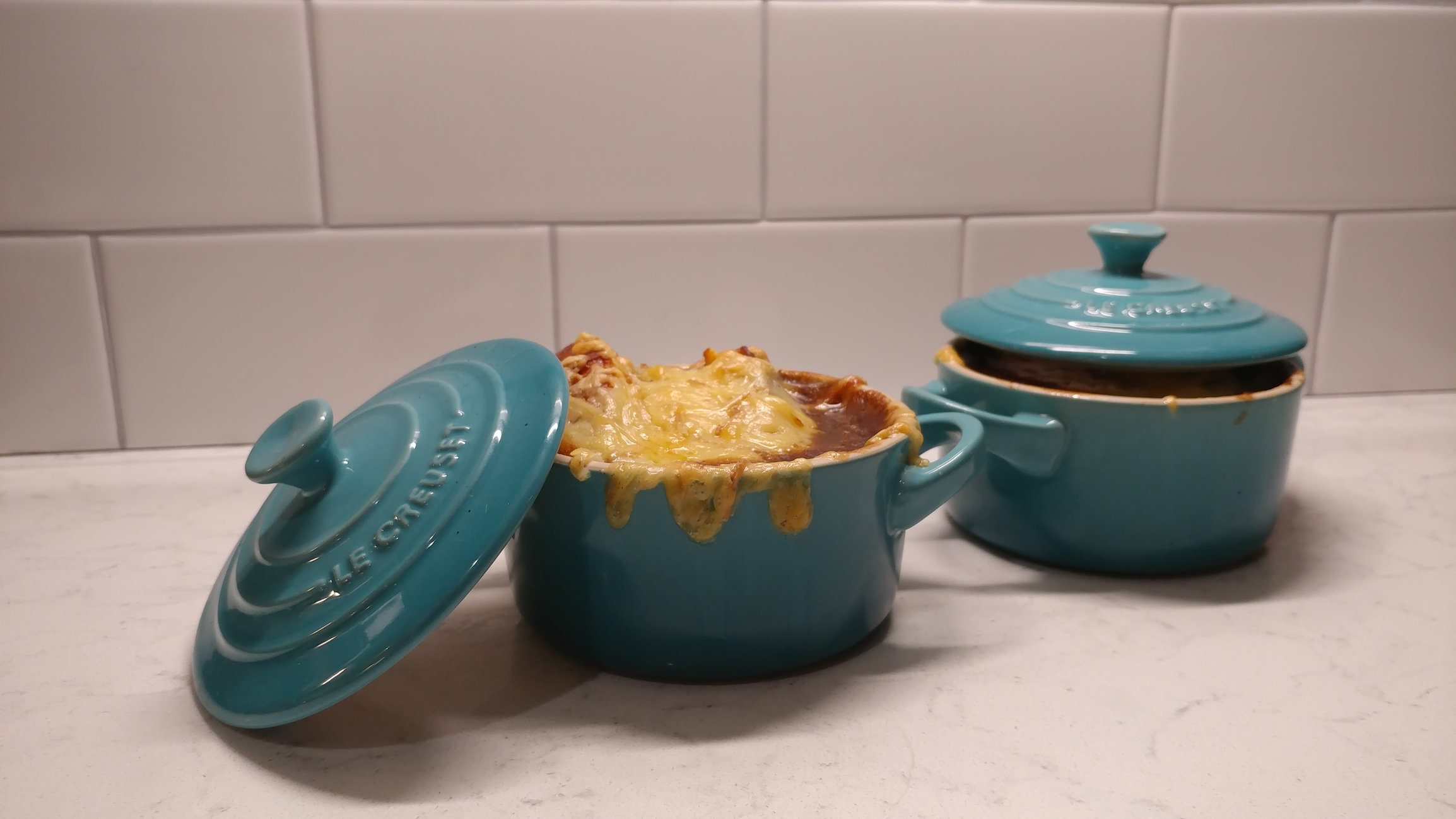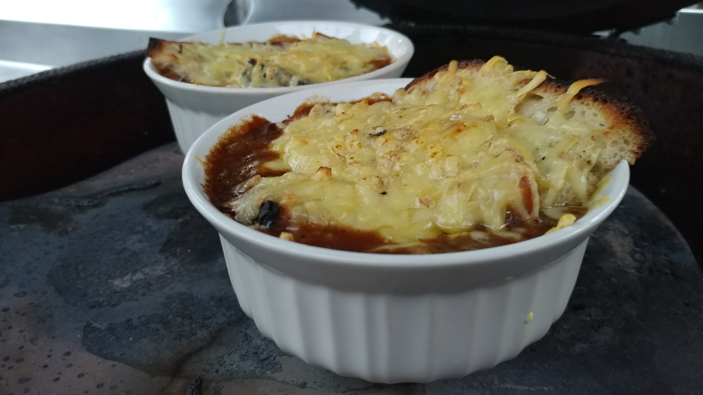 Get your Ramekin dishes or whatever you're going to use ready. I preheated the egg to 500 and then bumped down to 450ish. Ladle in the onion soup place your crusty bread on top and then top generously with your cheese.  Bake until nice and melty...roughly about 20-45 minutes depending on the size of the Ramekin. Enjoy.