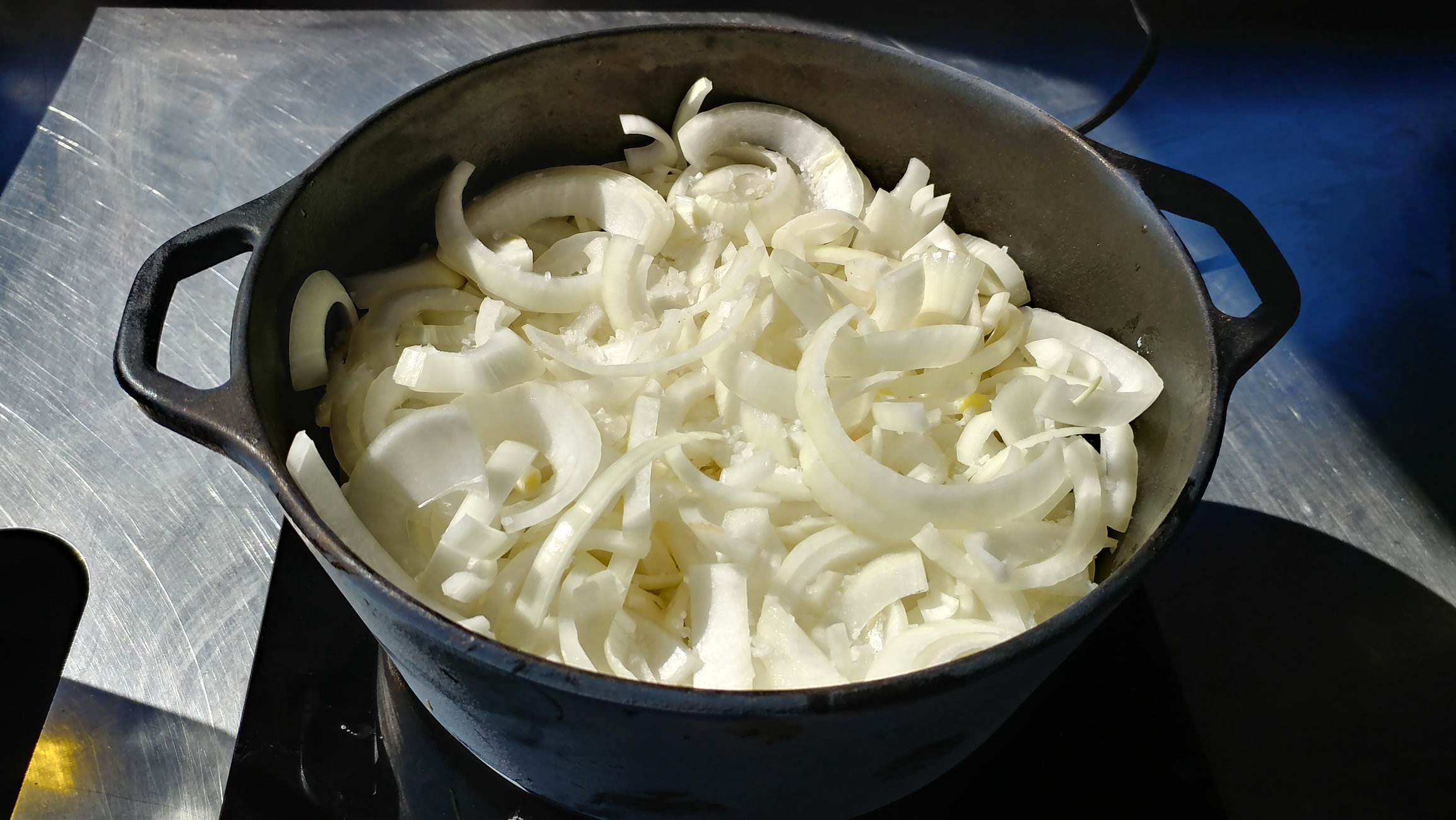 Using the same CI DO as I used on the bread I used the induction burner.  Started with a knob of Kerrygold butter and some neutral oil (EVOO is fine).  Add in the onions with some aromatics (thyme, sage, etc) & a punch of kosher salt (DO NOT OVER SALT).  Begin on medium heat to soften up the onions.