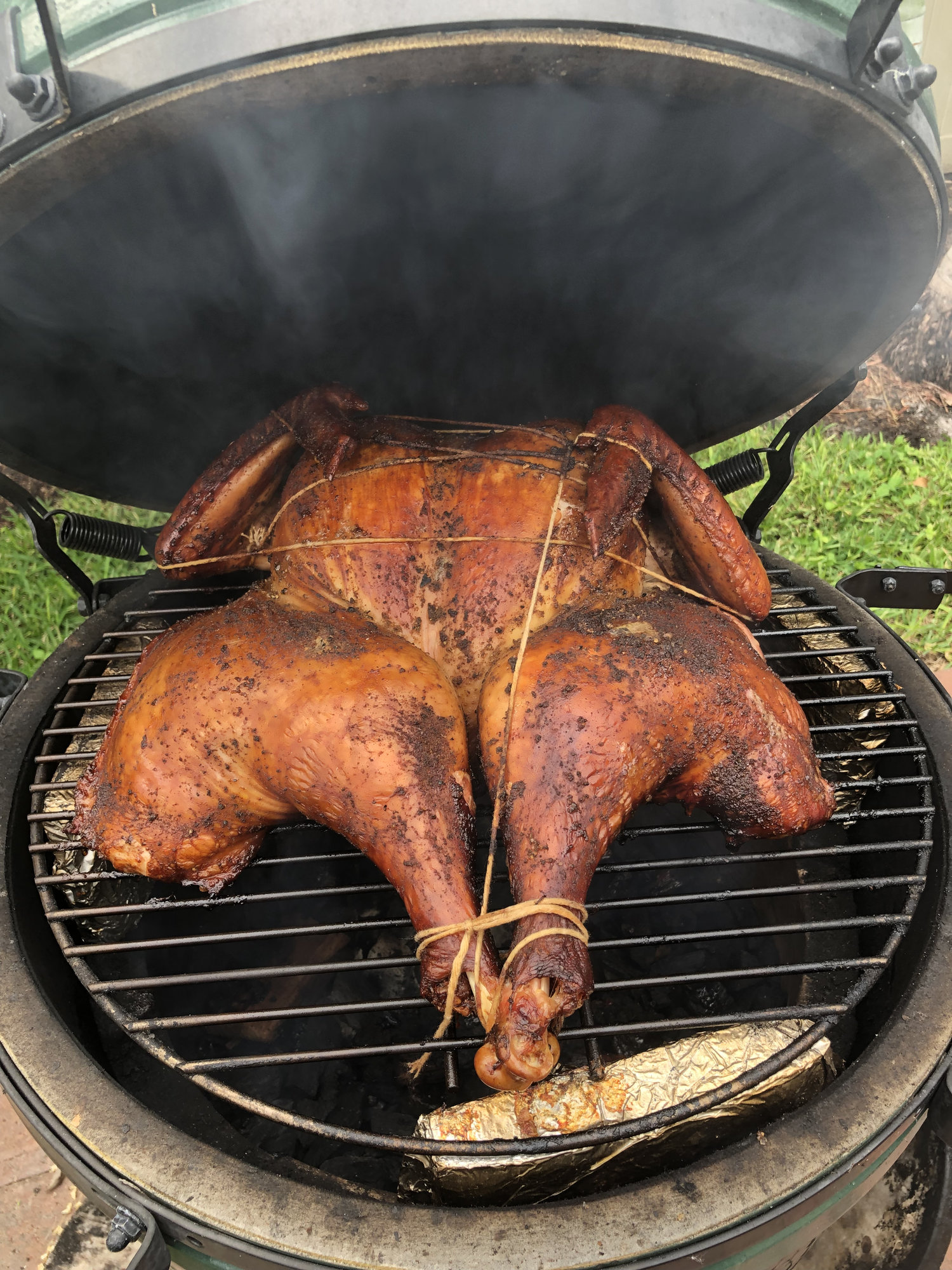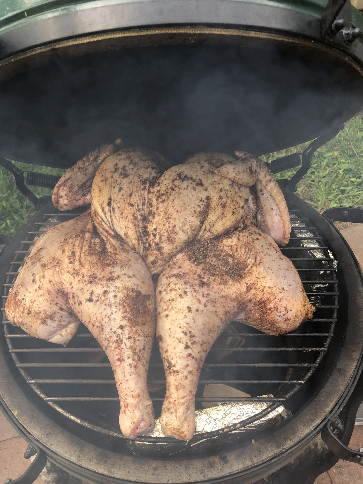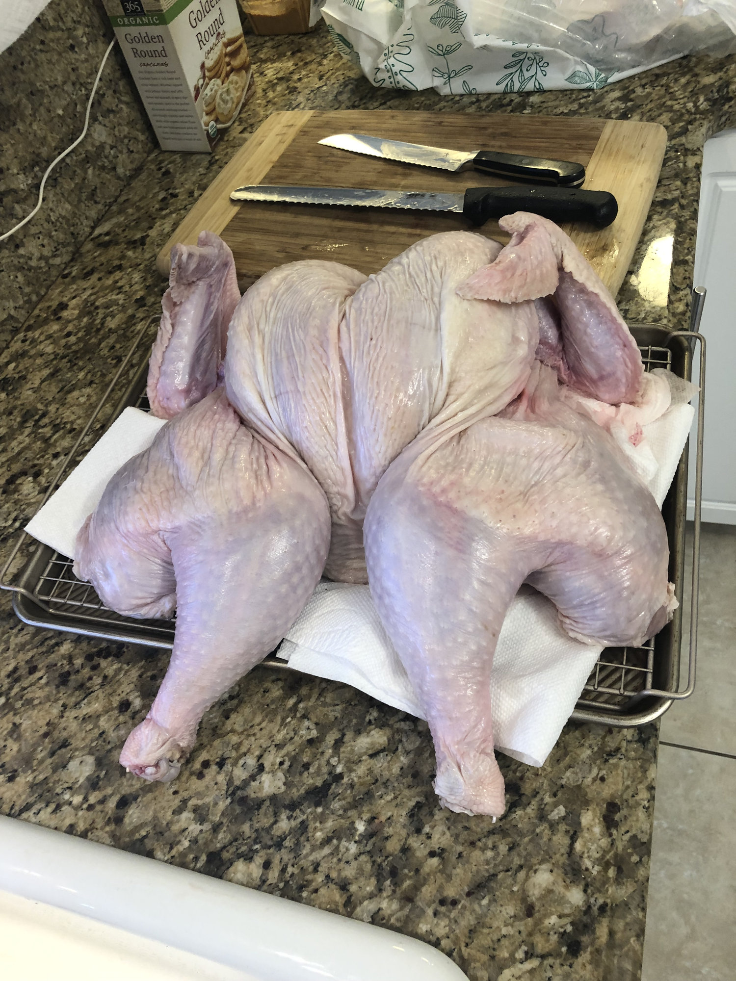 Just spatchcock’d a 20lb organic (don’t ask... wifey’s request) bird to dry out in the fridge over night. The plan is Mickey’s Coffee Rub and raised direct with some smoke. Stay tuned.