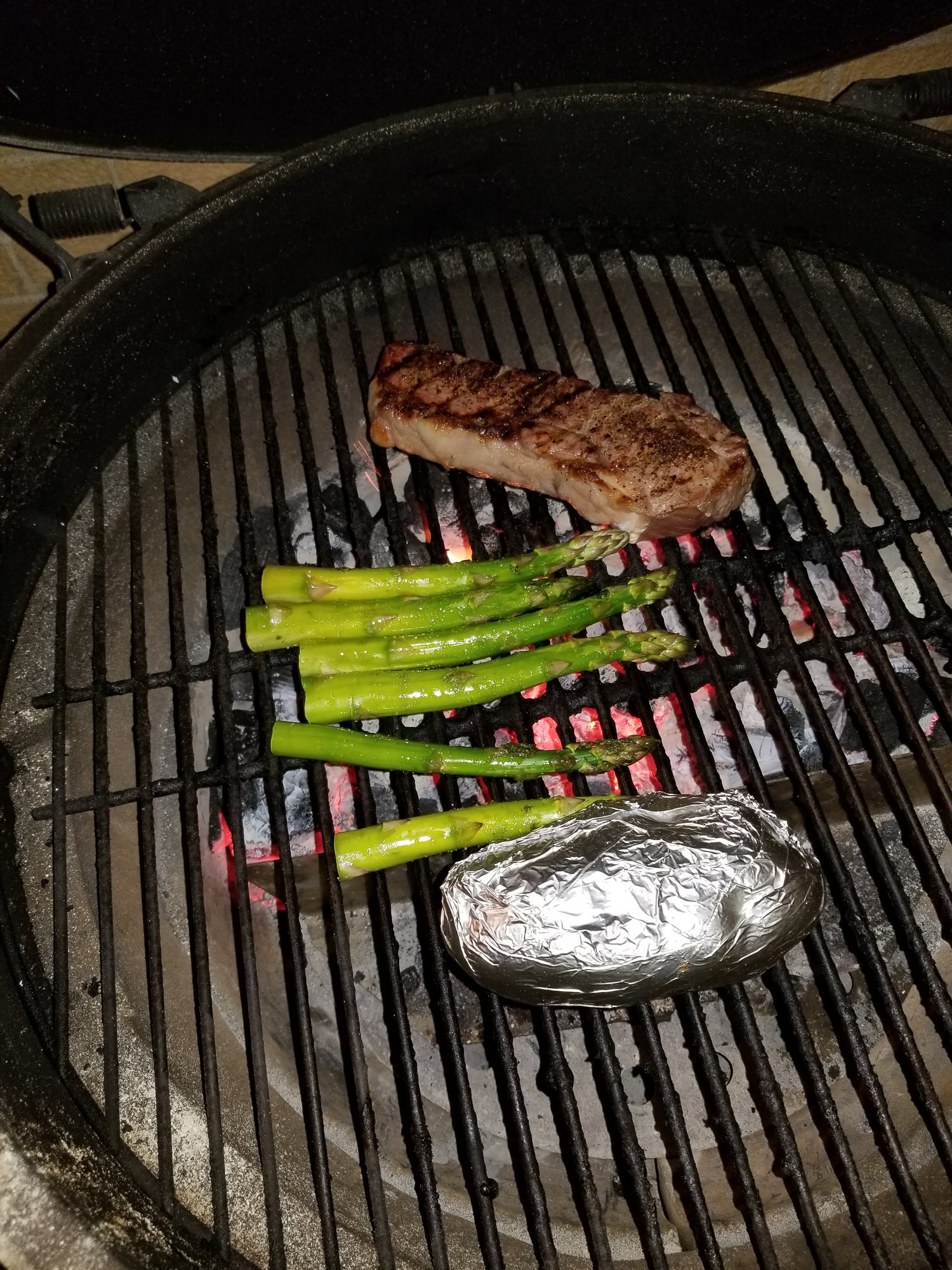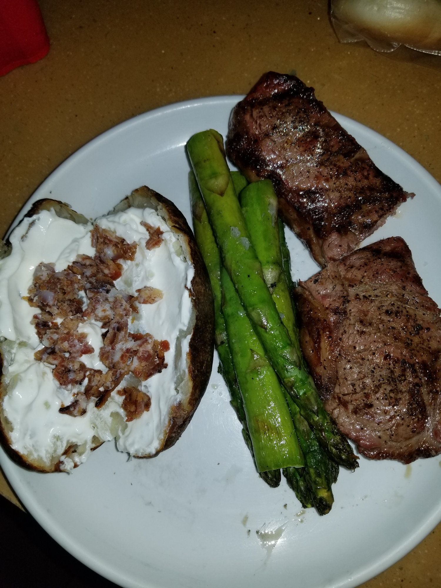 Friday night I was a bachelor so a steak was the obvious choice, in addition, I cooked some asparagus and a potato. A recent thread was started "where do you buy you meat from" I got to thinking, I'll leave the Costco steaks in the freezer and give the butcher a shot, big mistake, thin and a bit chewy. From now on, Costco only for steaks. Thanks in advance for looking: