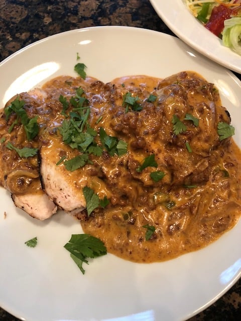 Had something like this at a local restaurant. Re-creation has us well fed. Carmelized onion and garlic. Chorizo augmented with paprika, cumin, coriander and ancho chili powder. Sheequan seasoned with N’s taco seasoning and grilled over RW. Jalapeño melting cheese amped with our home grown jalapeños with it all topped off with a fresh mexi-themed salad a la N. Yep. Have a great weekend brethren.