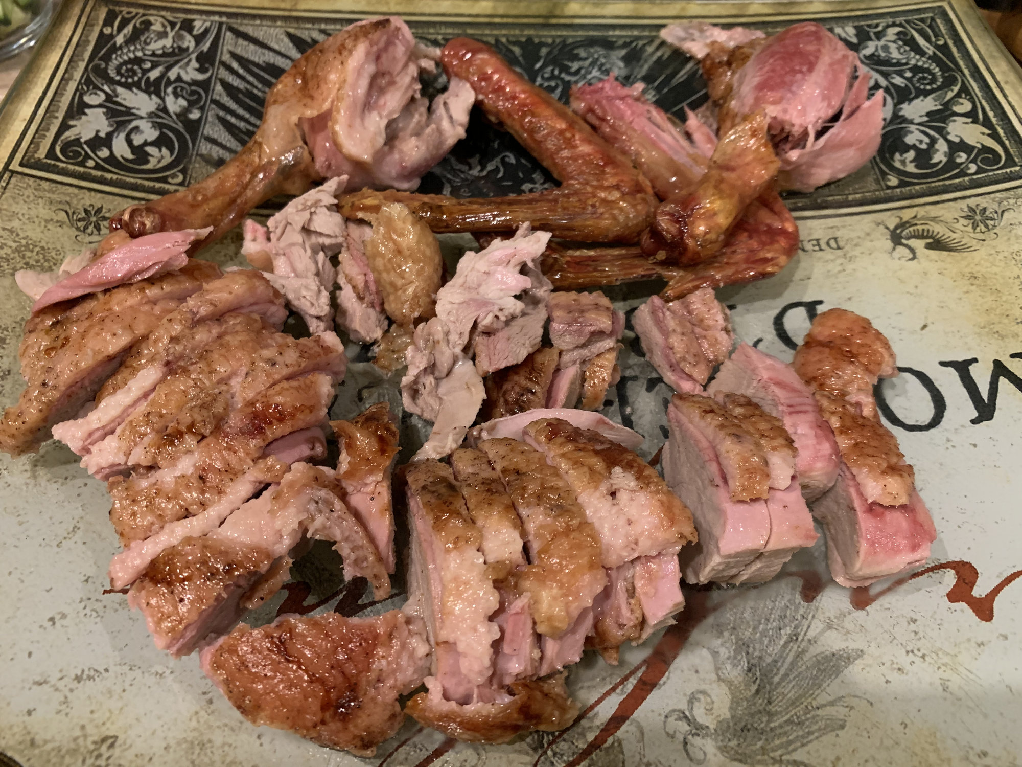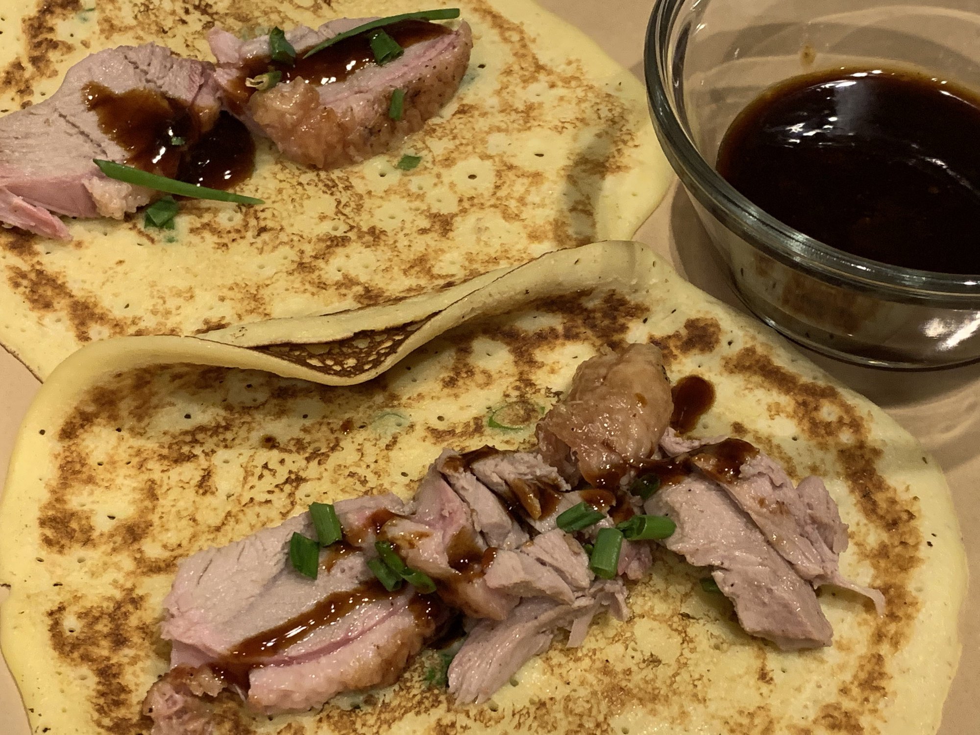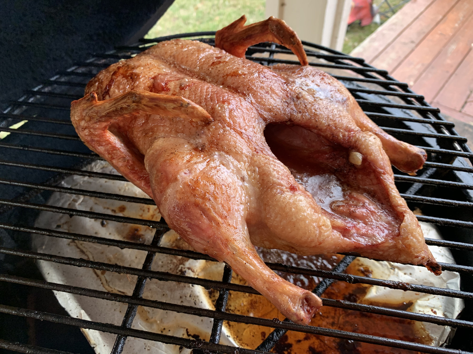 The family loves this Peking Duck style duck recipe, it is a holiday regular for us. The scallion crepes are devine. Cooked indirect at 425. Served with fresh berries and champagne.