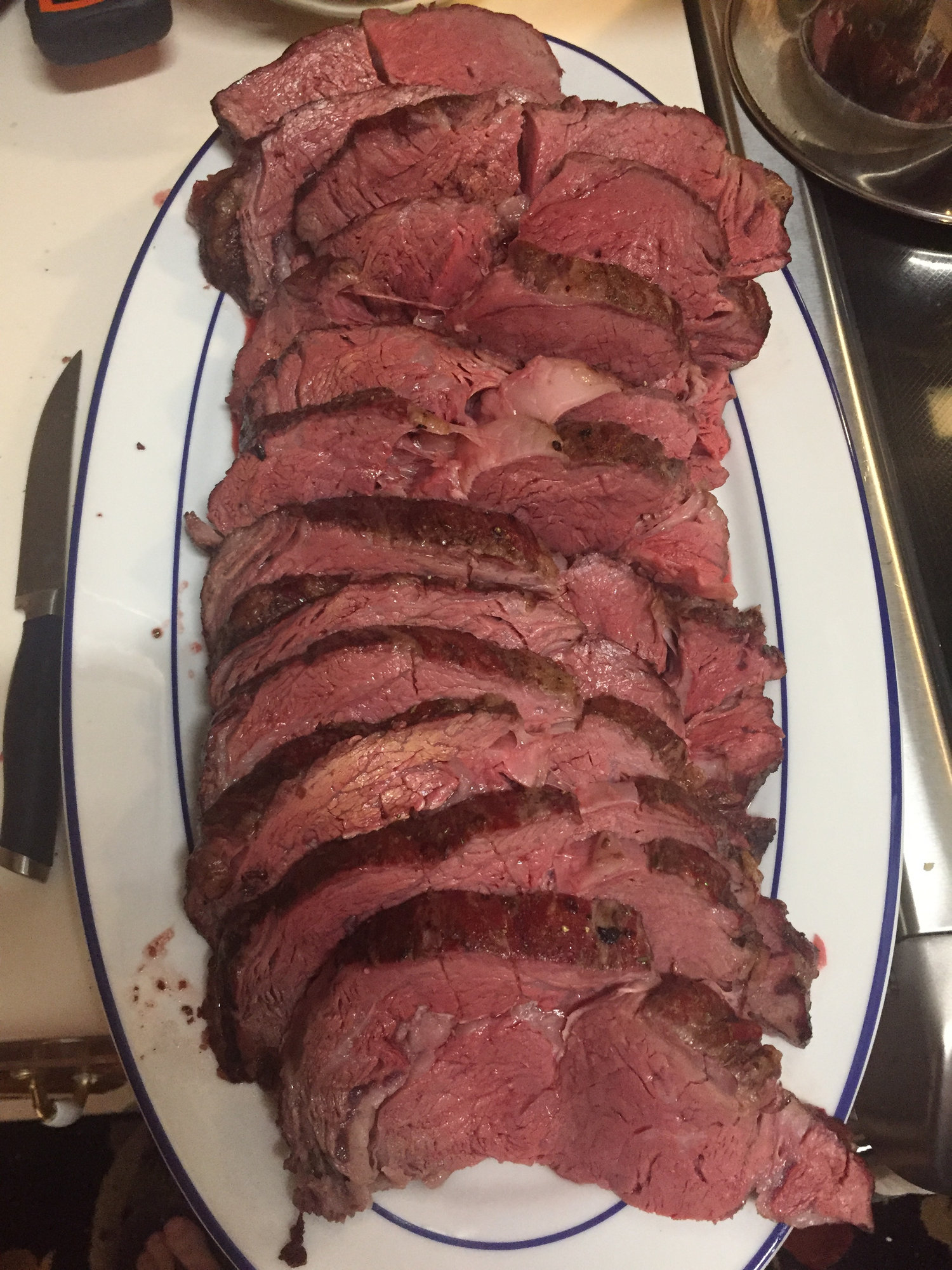 Trim the meat from the ends of the ribs and use for gravy. Cut the fat cap and silver skin off of the top. Cut the ribs off and tie them on with butchers twine. Pull the string tight to try and make the roast as round as possible for even cooking. I cook at 250 degrees until an internal temp of 126-128 degrees (I don’t bother with searing the meat). Let rest until 130 degrees for rare and cut. I don’t add any wood chips or chunks.
