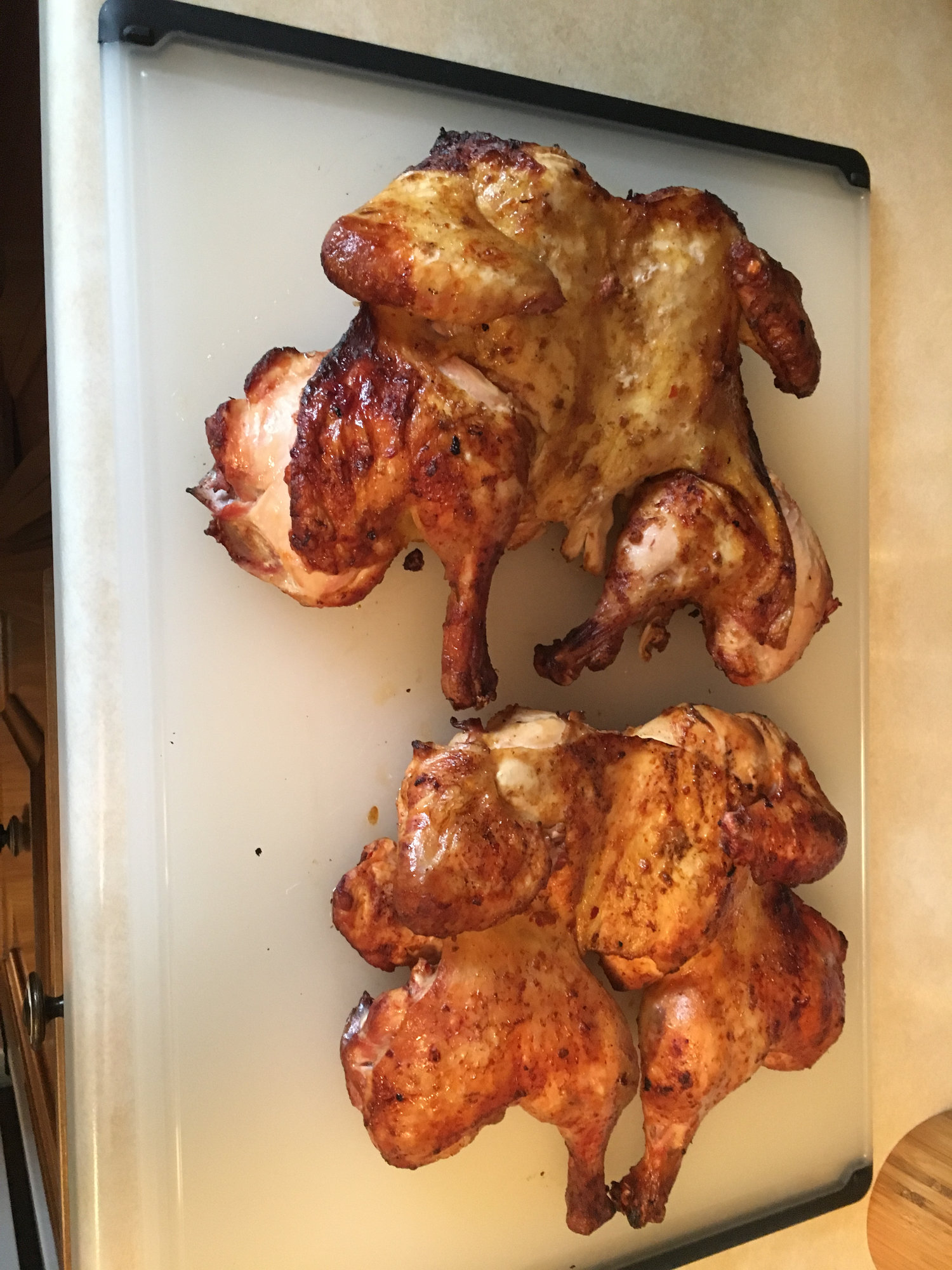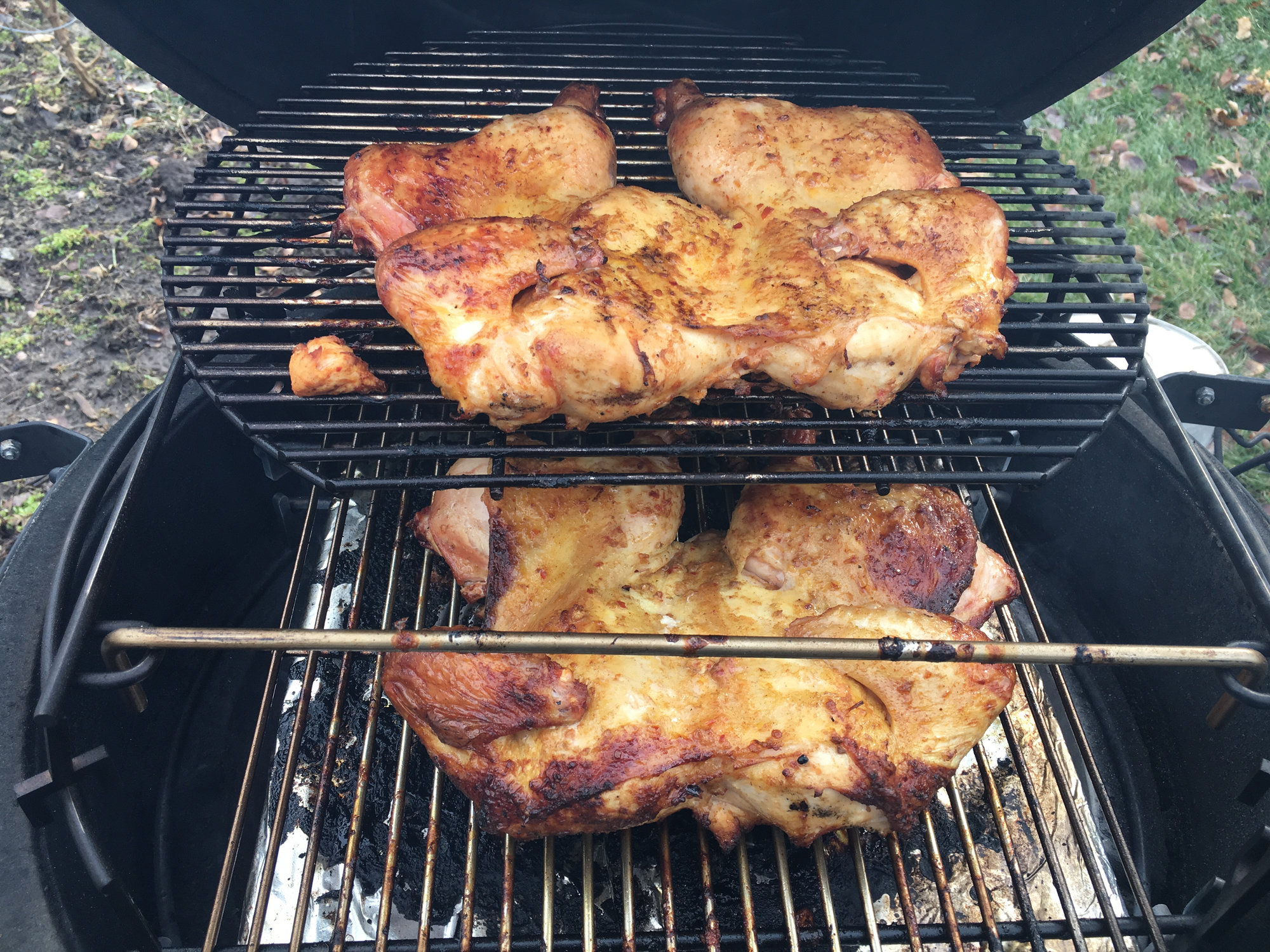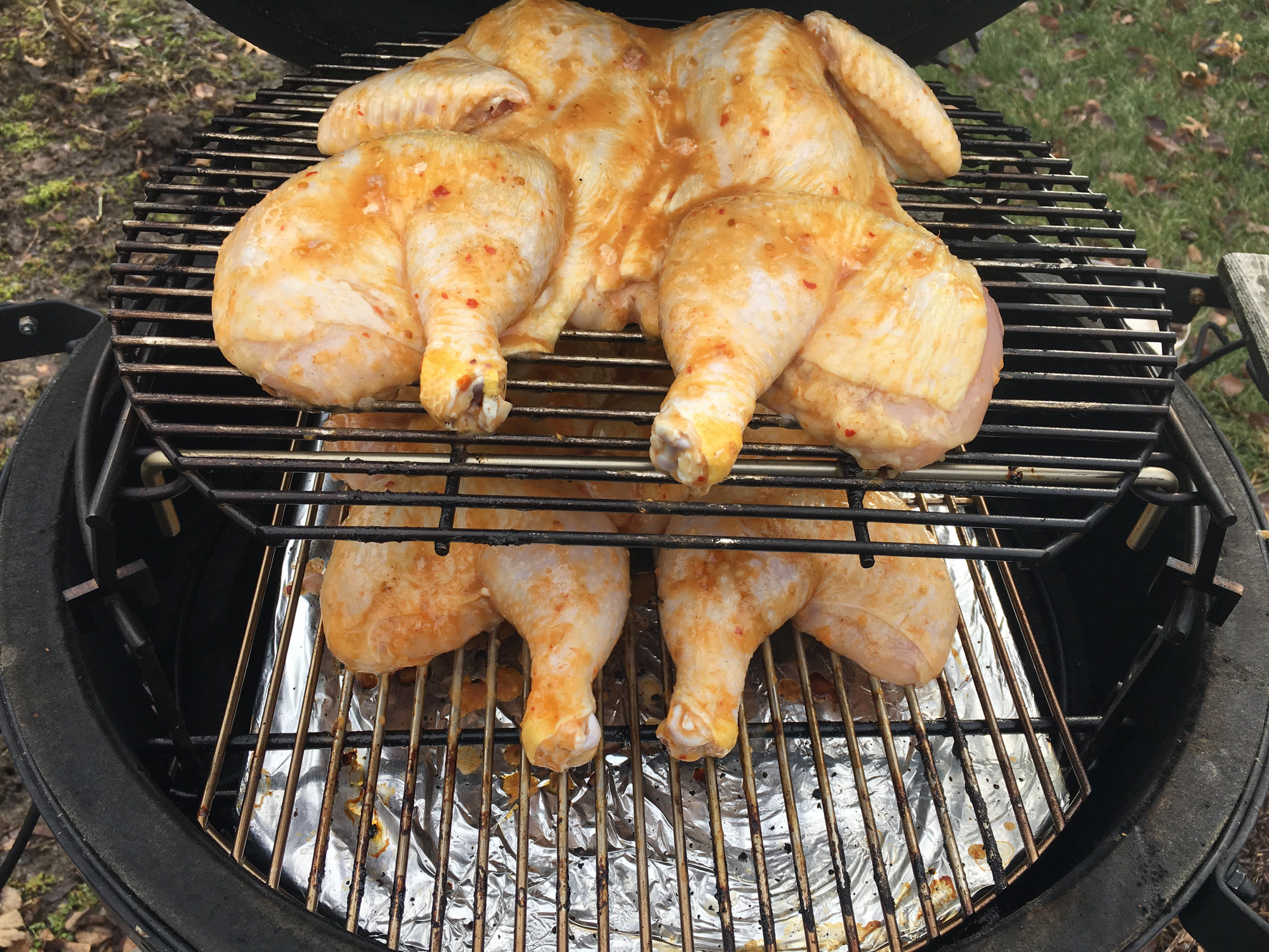 one bird with the garlic and one with the medium. Spatched them, removed the keel bone and the rib bones. Top bird started to get some color so I flipped them over. I willl let me ride a bit then flip and rotate the birds (top bird to bottom, bottom to top)