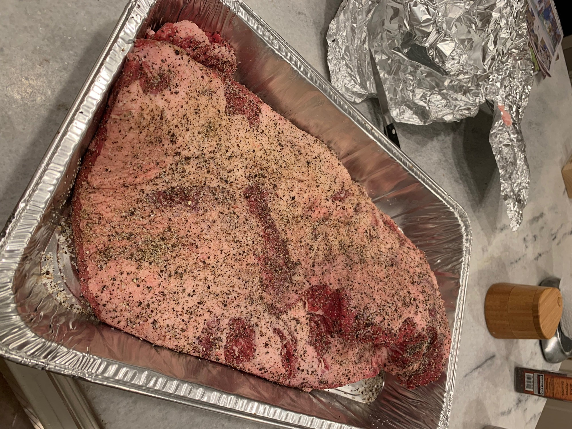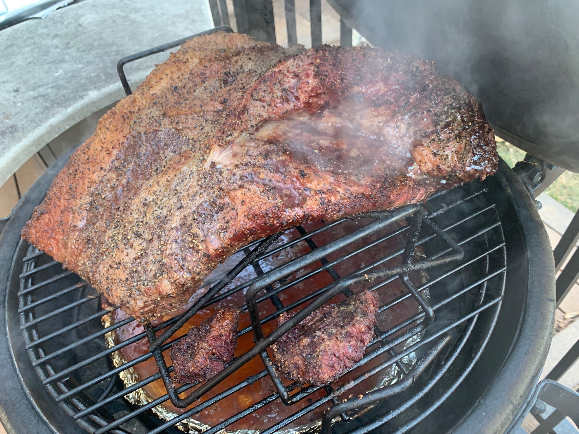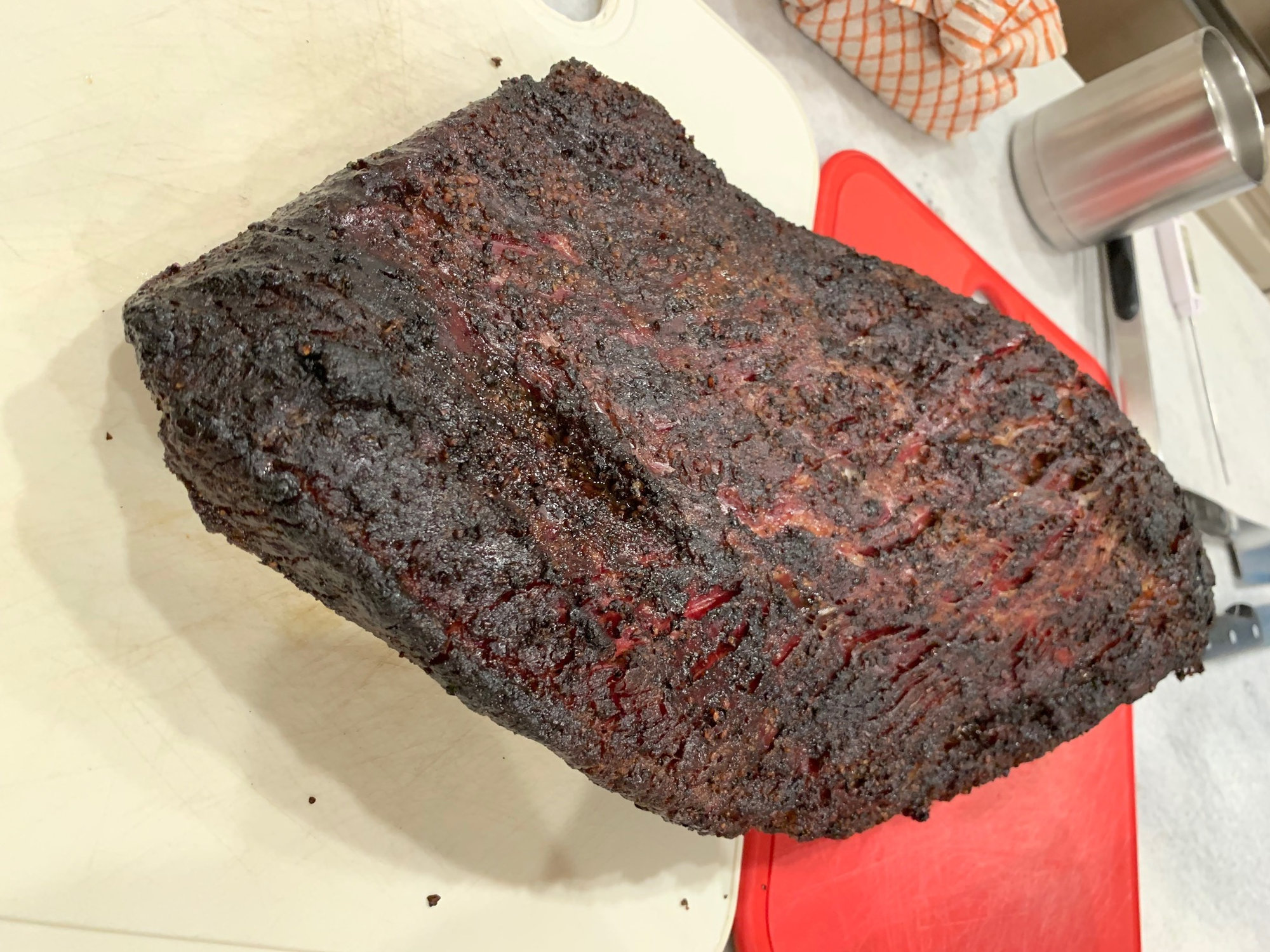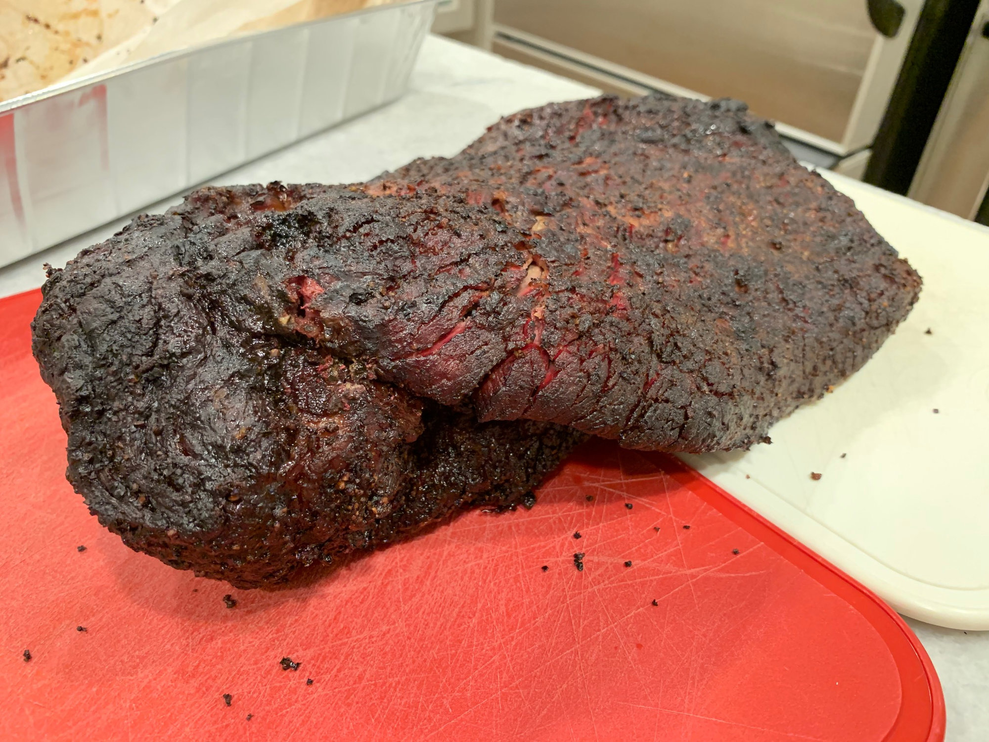 Bought a 16.8 lbs prime packer at Costco.  They were all huge there.  Trimmed a few pounds off.  Rubbed with S&P and a bit of garlic pepper.  Started it shortly after 5:00 AM, cooked for about 13 hours around 250, then let it rest an hour.  Used Rockwood lump, a few hickory chunks, and a bunch of pecan chips.  Wrapped in butcher paper for the last 3 or 4 hours and let BGE temperature get around 300 at the end.  Was on an inverted v-rack until I wrapped.  Spritzed with mix of water and apple cider vinegar a few times.  Took much longer than expected for bark to start forming.  Also chased temperatures all day, jumped over 300 for a bit in middle of cook, and then was sitting in lower 200s for a longer time after that.  That high temp period in the middle may have melted off too much surface fat which in turn limited the bark.  This was also my first cook with the Smokeware cap, which I liked, but need to dial it in better.