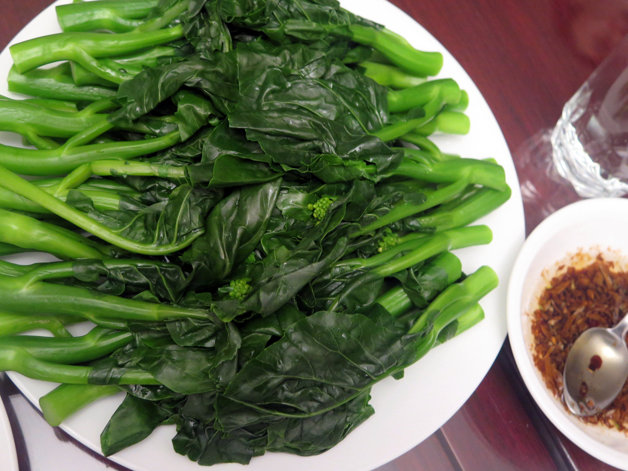 Blanched baby Gai lan (Chinese broccoli) served with fried garlic oil...