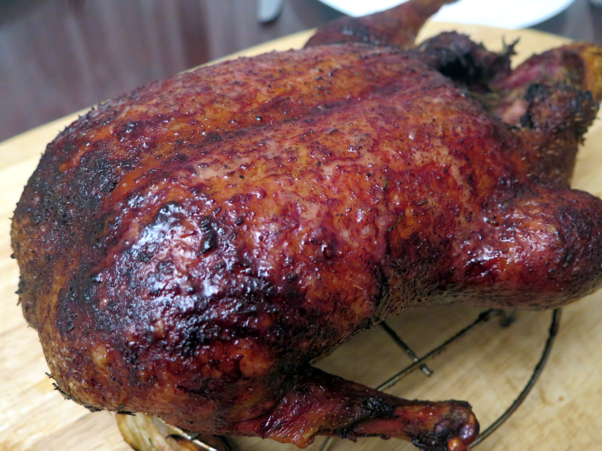 Duck roasted in Traeger pellet pooper... (followed roast duck recipe in Traegergrills.com, nice bite through skin but not crispy like Peking duck)