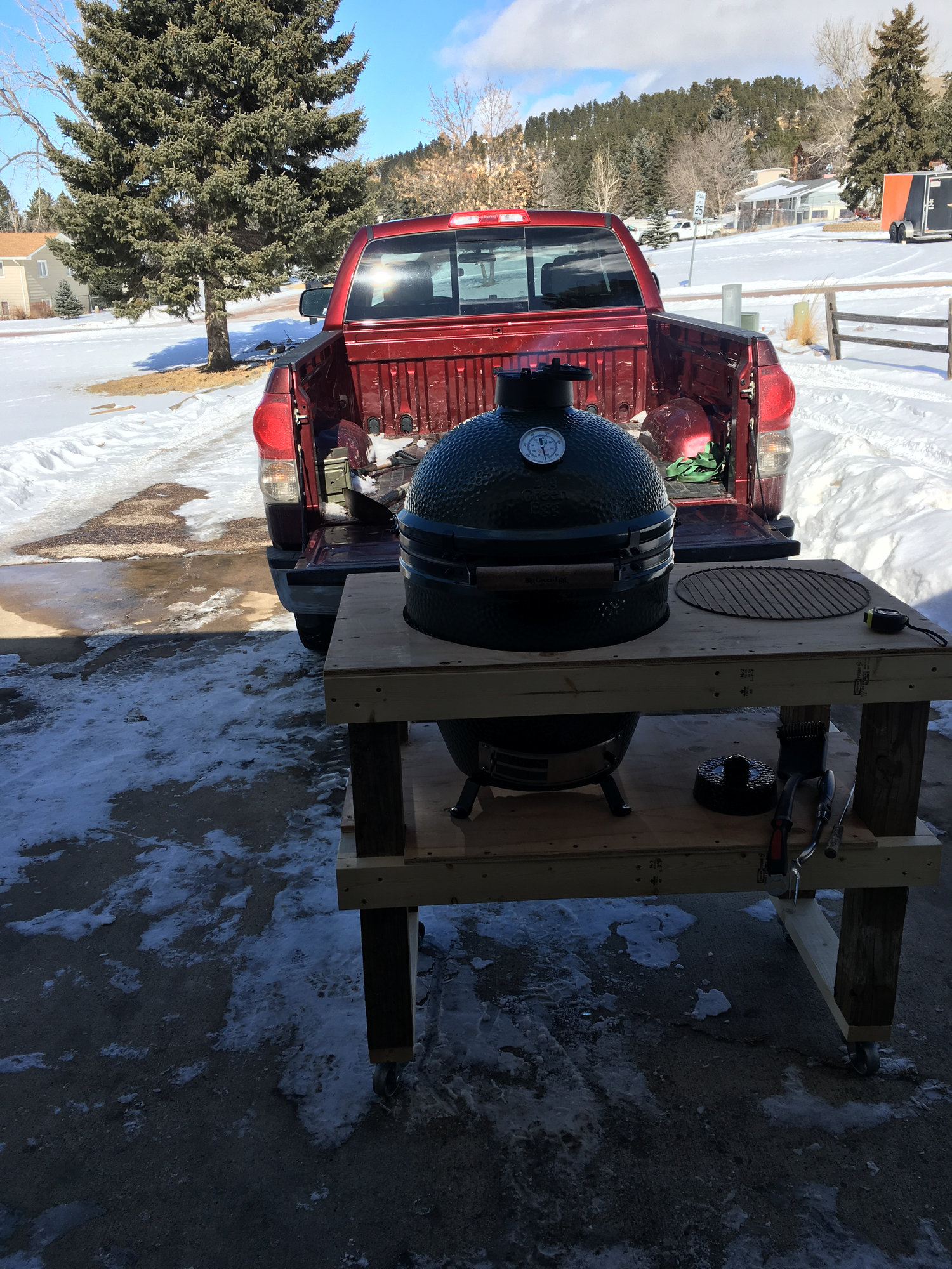 First off I want to say thank you to all here for all of the info I have been able to get from this forum over the past few weeks. I have been using a cheap charcoal grill and a homemade barrel smoker for years and decided to up my game. I was planning on getting a pellet smoker and then started looking into the egg. I was able to find answers to all of my questions with searches on this forum. Last Thursday I bought a large egg on my way home from work. I had Friday off so I built a table in the morning, put the egg together and had a rack of ribs on it by about 2. Built a pretty simple table with what I had around the house, figured I can use this one as a test to see what size etc I like and rebuild it nicer next summer. Also ordered the adjustable rig from cgs but it didn’t show up till today so I had to improvise for a higher rack and some tin foil underneath for drip pan. So ribs Friday night, smoked pork butt for 12 hrs Saturday, grilled salmon and halibut for lunch Sunday and onion bombs with the left over pulled pork for Sunday night dinner. Just realized I didn’t take as many pictures as I thought, too excited to try the food I guess. Great first weekend with the egg, very happy with my purchase.