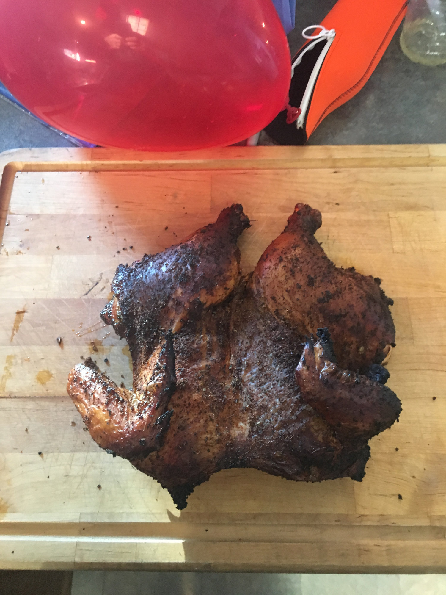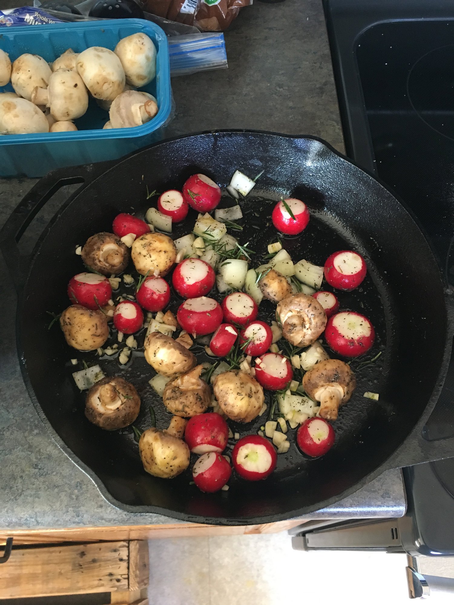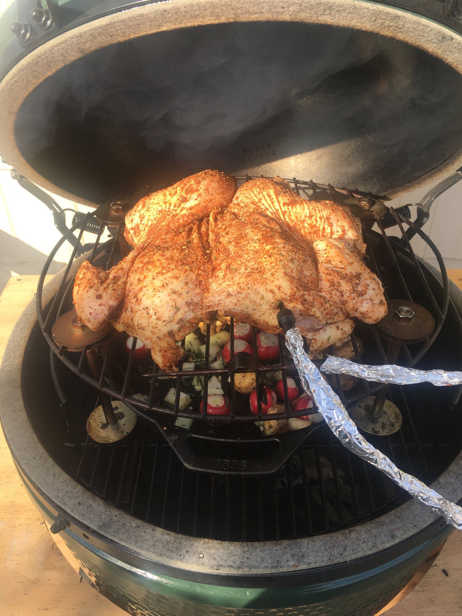 So Friday started out with some reverse seared ribeyes with a butter mix on top and some roasted veggies.  Saturday was wings with a white sauce and jalapeño poppers. Finished the weekend off with a spatchcock chicken and some radishes, mushrooms, garlic and onion in CI.  Put the CI veggies under the chicken which made it indirect and had to cook longer than planned. So the veggies cooked longer than planned, even though I pulled them about 20 min before the chicken, so they were a little blackened, but still were delicious.  So I did my first beer can chicken earlier this week and this is my first spatchcock, my wife and I both liked this one better, but in all fairness I learned a few things in prepping on the first one that helped this one.  Bottom line is both birds were delicious and better than the store bought rotisserie chicken.  So, just over a week as an egger and loving every meal. Sorry for the pics being out of order, seems I haven’t figured that out yet.