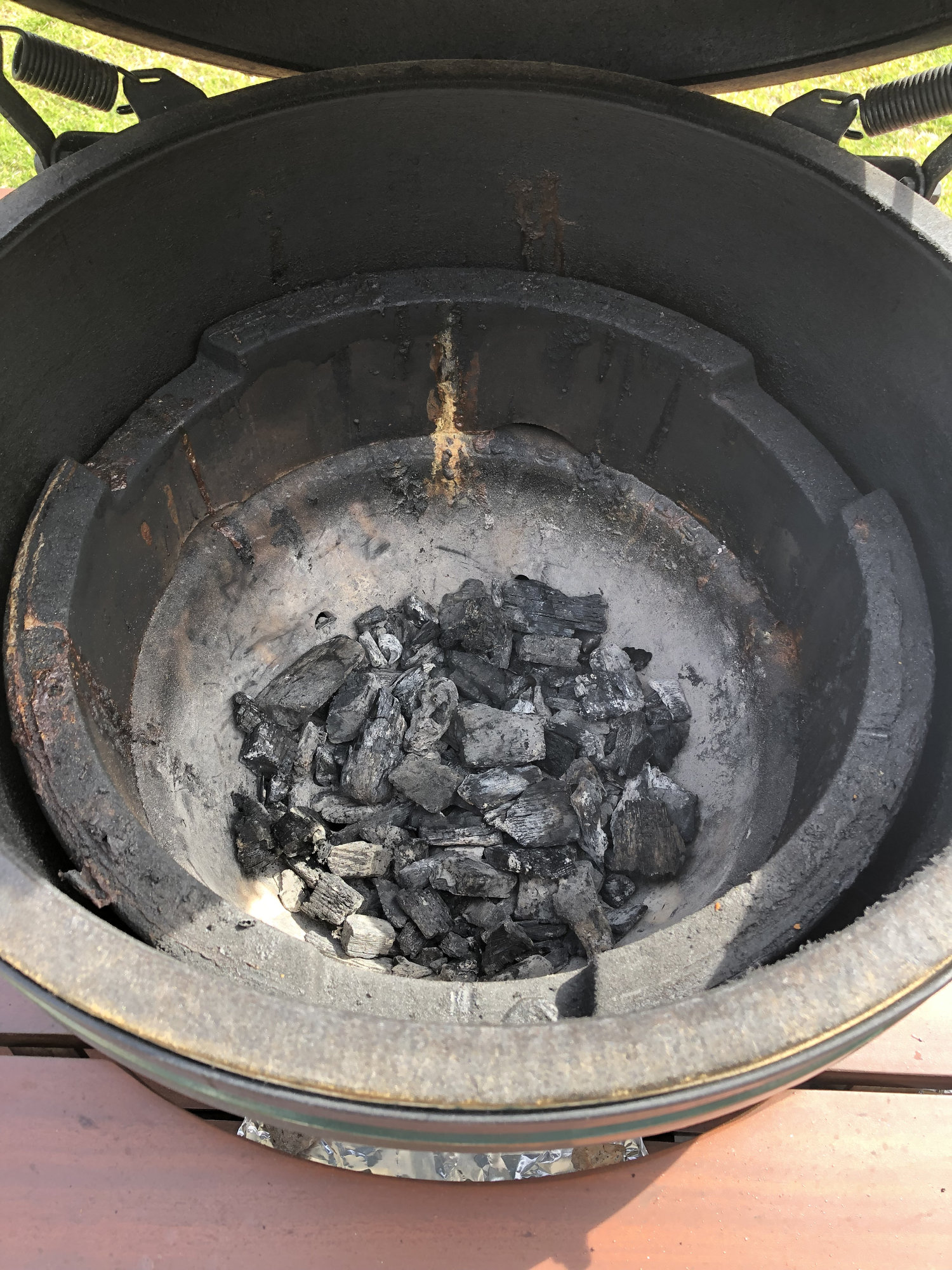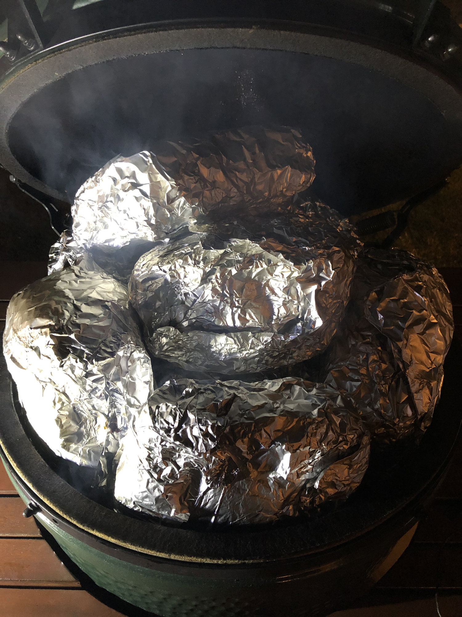 Little over 9 hrs in and internal temp of 145 in one of the shoulders and I could smell a little burning grease odor. Not wanting to risk my pork tasting like burnt grease, I checked and found that the color was nearly where I would like it so I decided to wrap all of them and return to the egg. I removed my full drip pan at the same time and only only left the spider and stone and stock grate in place. Returned all wrapped pork to finish up. No concerns with lump capacity at this time. Sorry didn’t get any pictures of the pork pre wrap. I was rushing to keep the dome closed as to not start a grease fire.