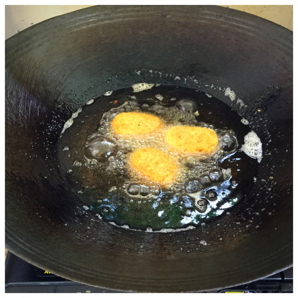I double breaded them to make a secure “shell” that will hold the creamy filling. If they leak during frying it makes a mess in the oil.