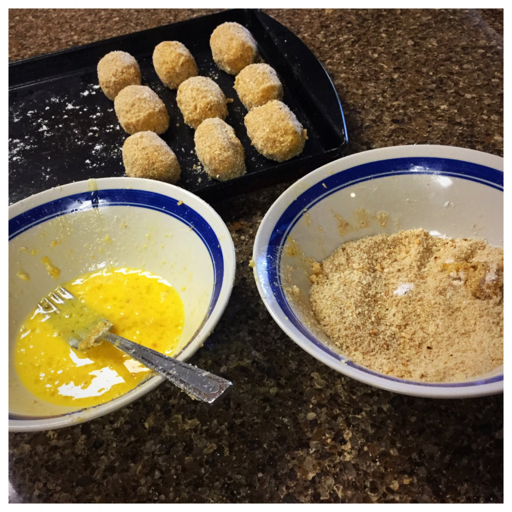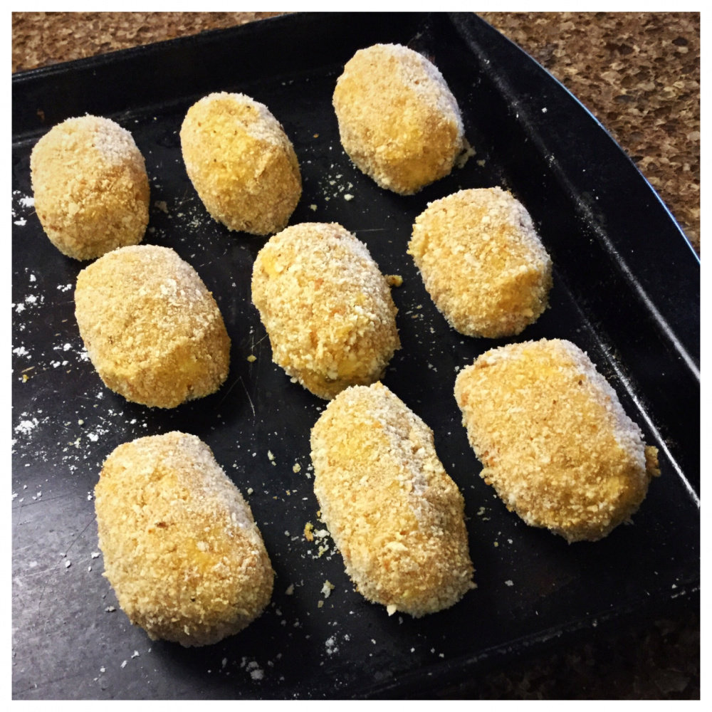 Once these are all formed then finish breading by rolling in egg and then coating in breadcrumbs.