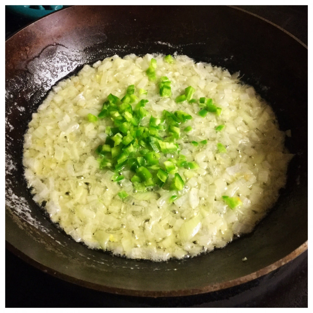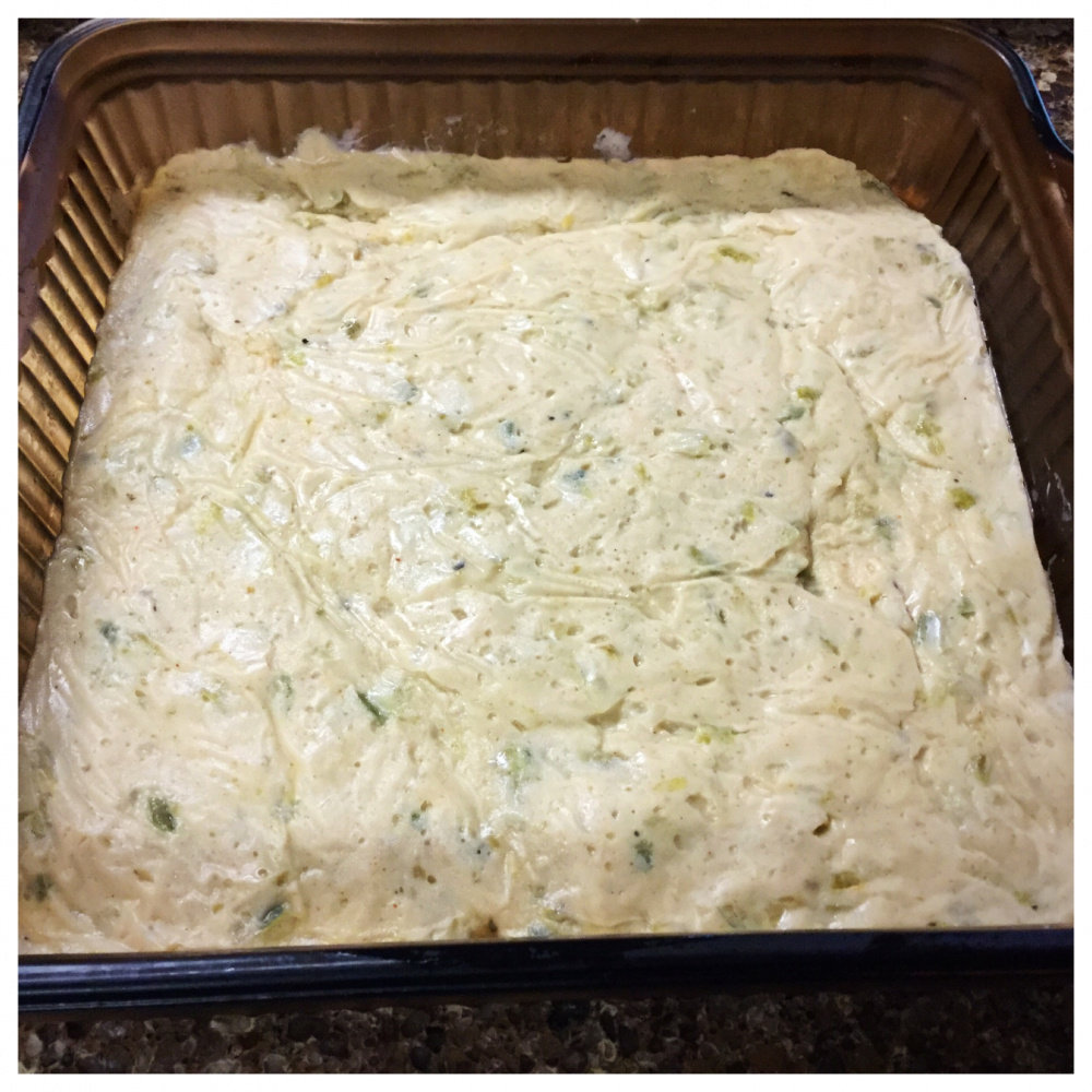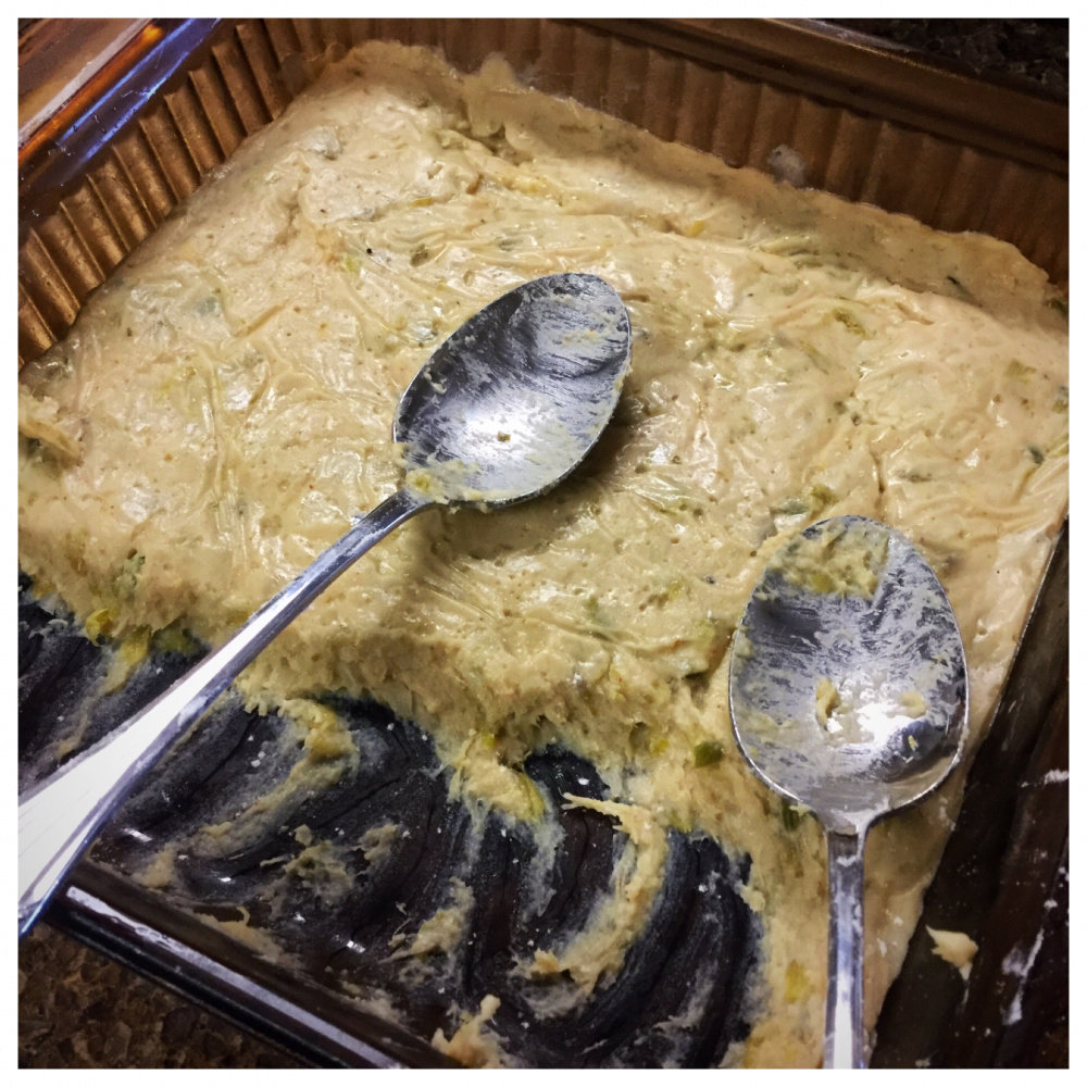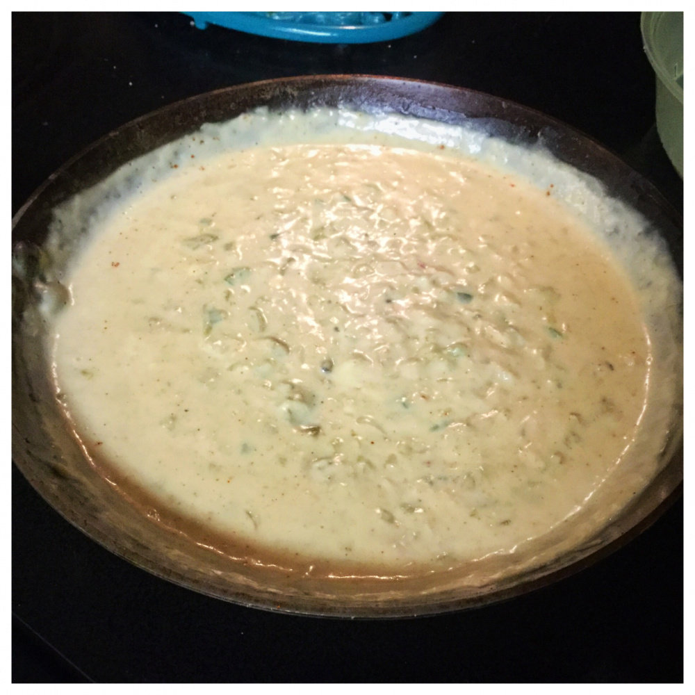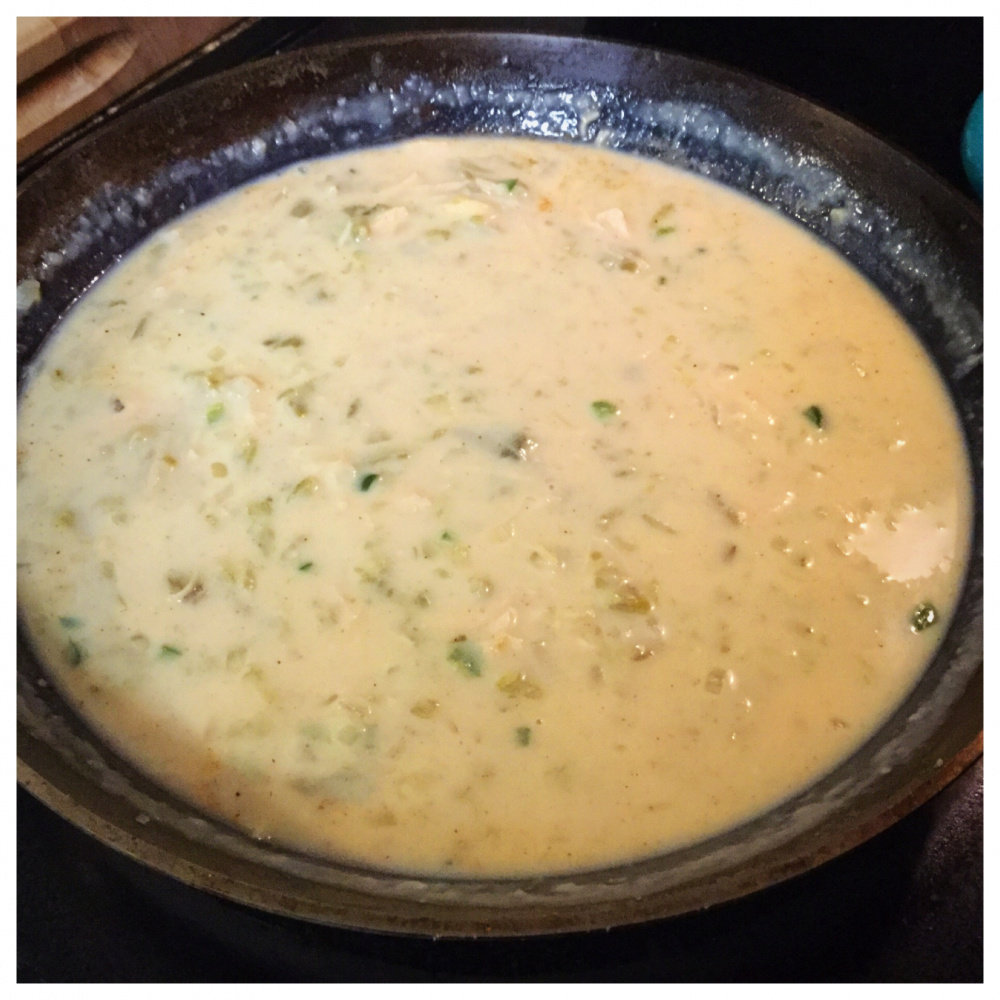 To that I added the flour to form a roux. Then I added milk. Once the sauce began to come together I added chopped chicken, a buttload of green chilies, diced jalapeño and some chipotle spice mix.
