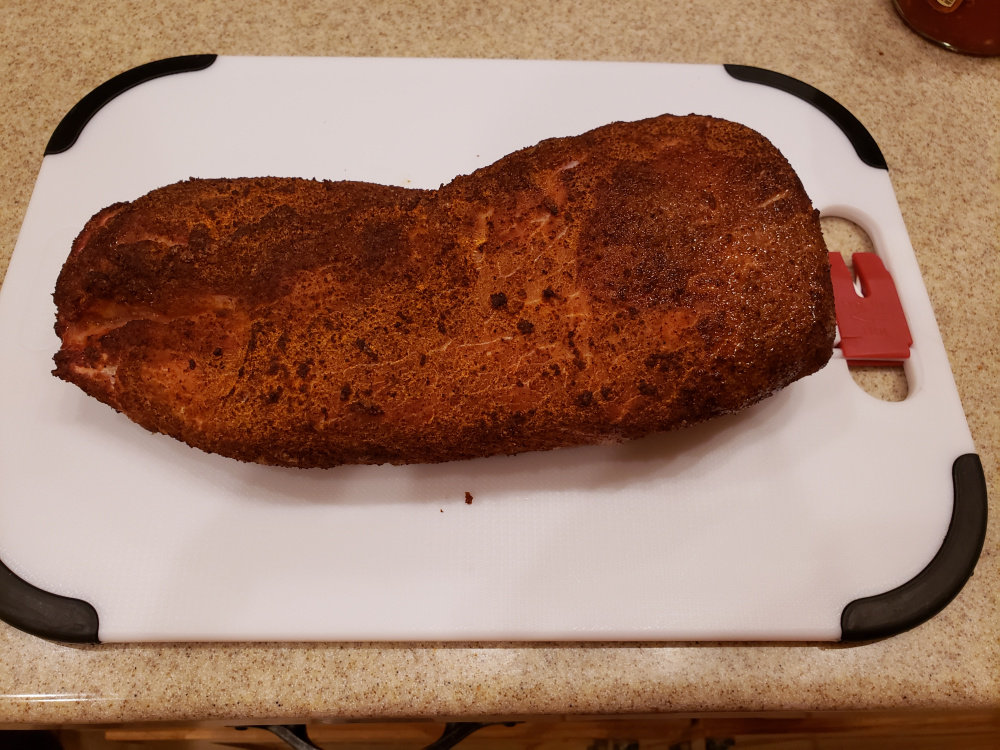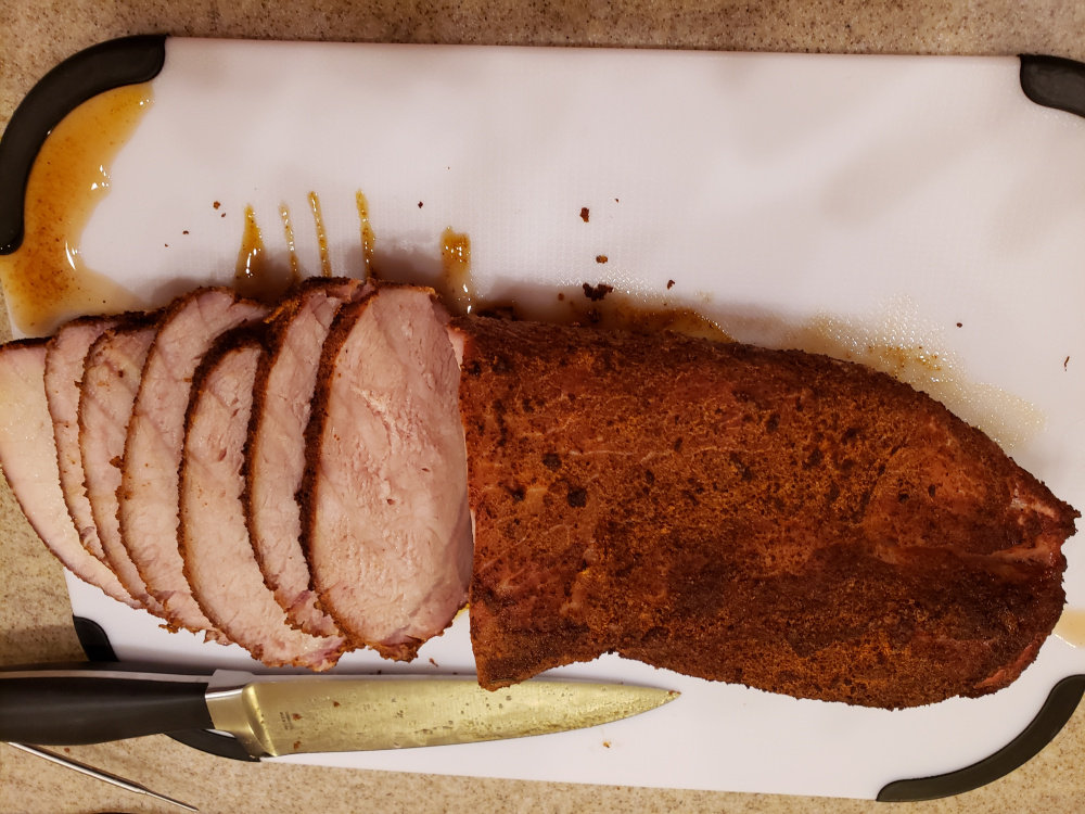 Cooked at 300° to an IT of 145. Used Bad Byron's Butt Rub and pecan wood for smoke. Not sure what order pics will come out, but you can figure it out.