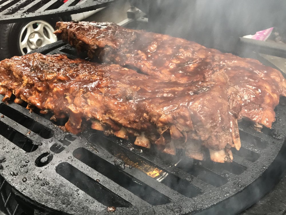 Our ribs have been on between 4-1/2 and 5-1/2 hours. After pulling them, set them aside and get the egg up to 275. While the temp is climbing apply the desired amount of bbq sauce on the ribs evenly. Today we used Blues Hog. Many competitors use this. Pull the V-Rack off. You want your ribs laying flat when finishing. Place the ribs back on the egg bone side down. Leave on for 20-30 minutes. If your guests allow, pull off, let rest for 5-10 minutes, slice up and enjoy.