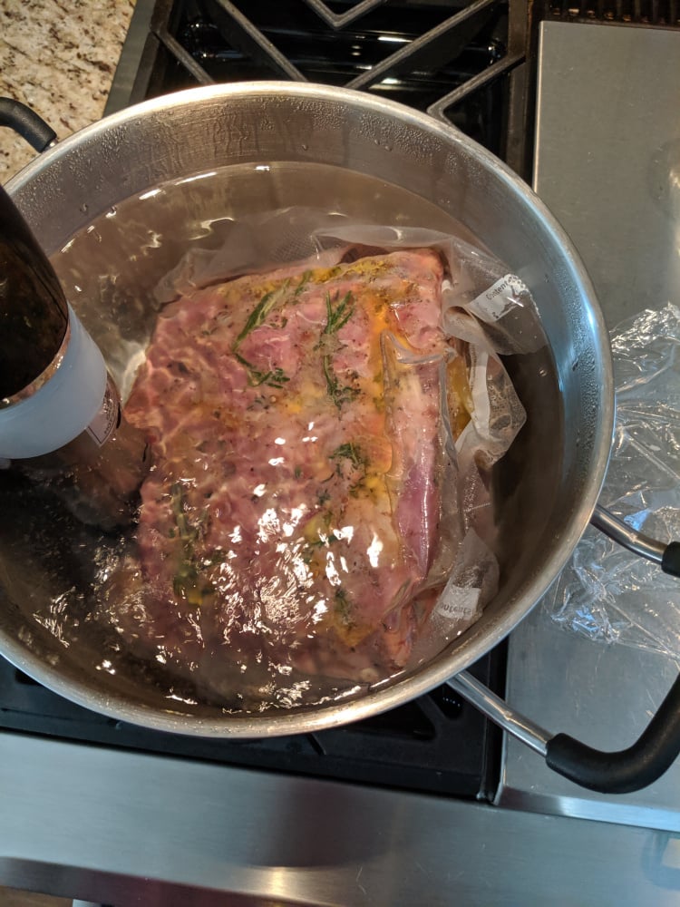 Hot bath for about 8 hours, then into the egg for a sear. More to come.