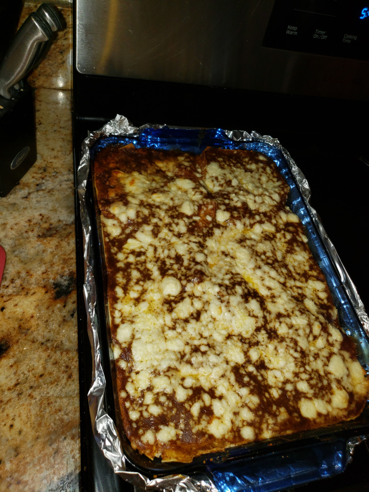 Time for assembly. I am lazy and layer it like a casserole instead of rolling individual enchiladas.