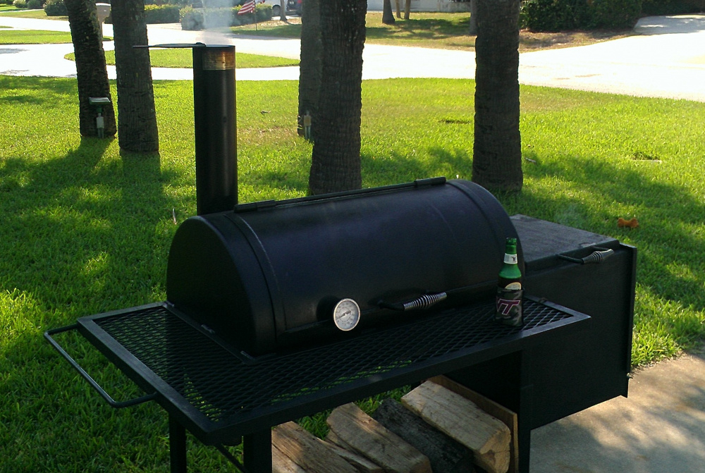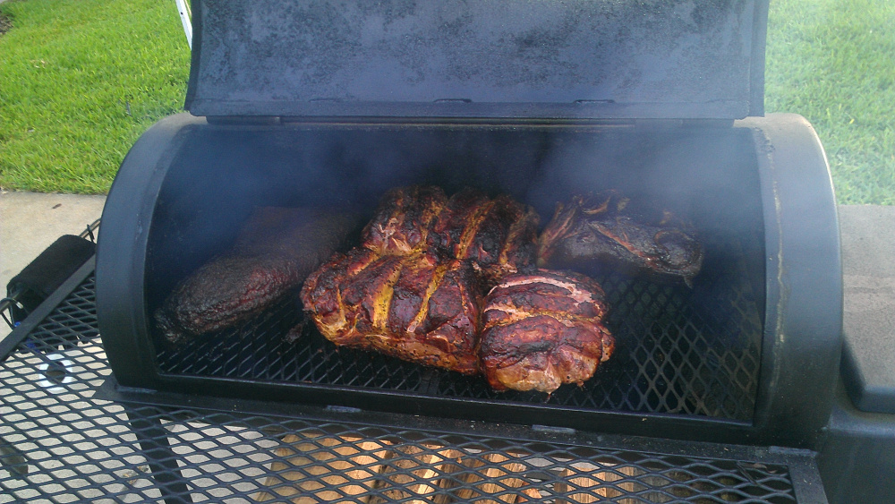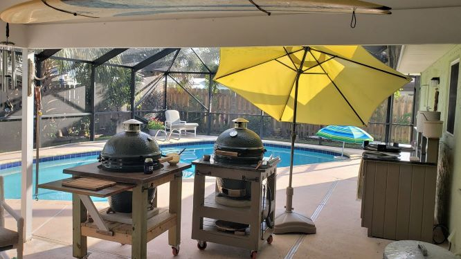 XXL BGE, Karebecue, Klose BYC, Chargiller Akorn Kamado, Weber Smokey Mountain, Grand Turbo gasser, Weber Smoky Joe, and the wheelbarrow that my grandfather used to cook steaks from his cattle