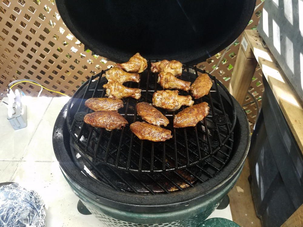Here is my first batch of wings on my minimax. 375 with cherry smoke. Pulled at 180. Sauced with some sweet baby rays. I wanted to try doing the leg and flapper together. Not sure I like them this way. I just put on another 12 wings (cut in half) and some corn. Will have those up shortly as I keep getting the other large BGE ready for tonight.