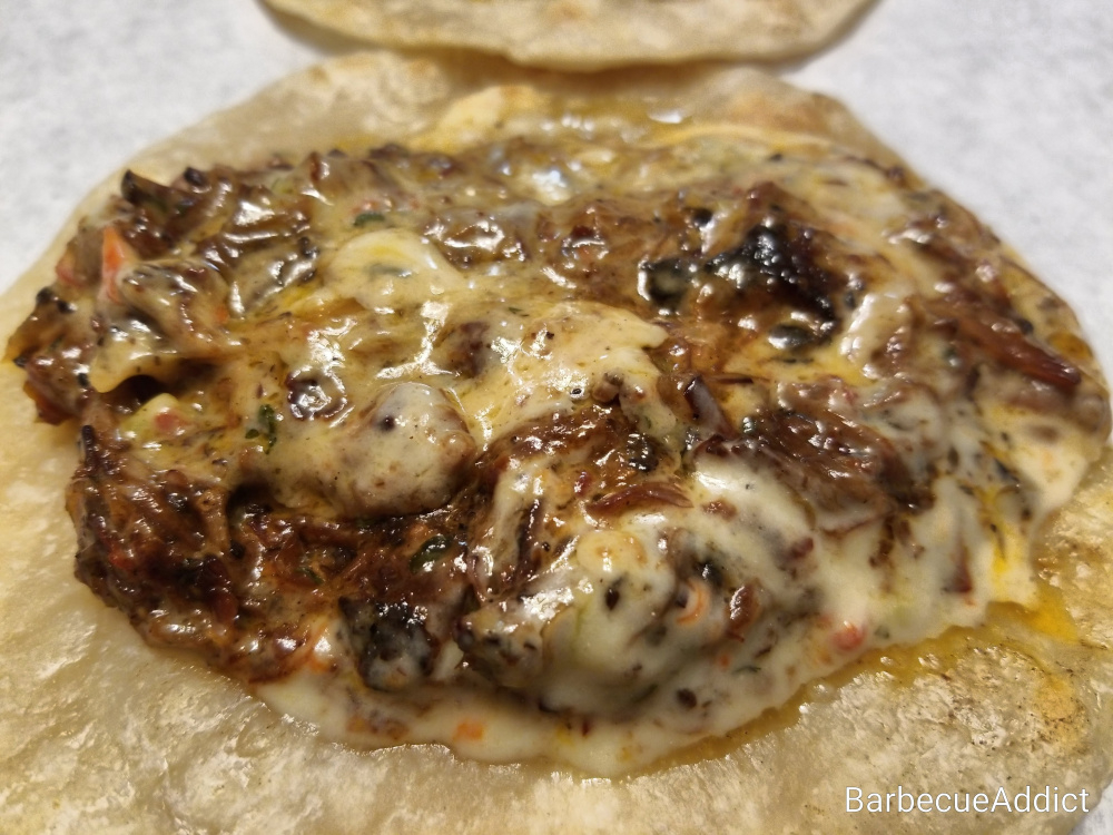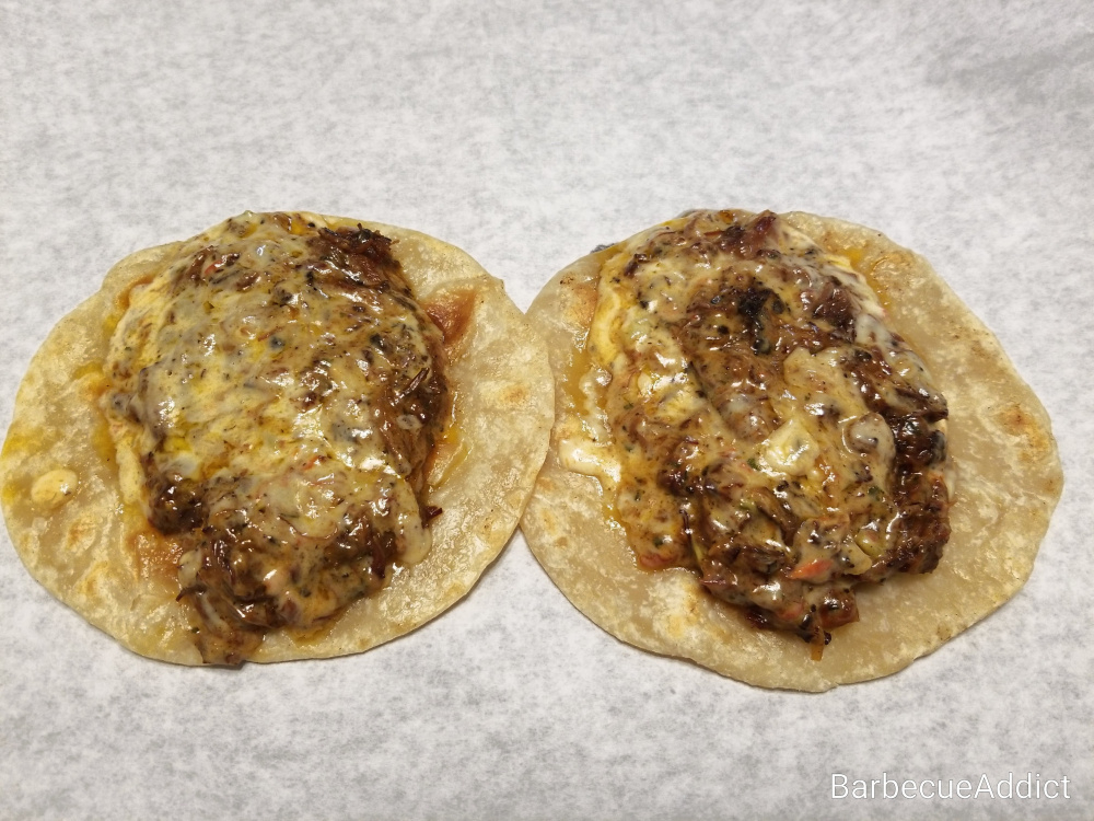 My dinner plans for today involved pizza but when I found out about the holiday, I couldn't resist. I used leftover jerk oxtail from a previous cook, along with pan roasted garlic, caramelized onions and sauteed kumato tomatoes to make a Ragu sauce for Taco Norteños. Instead of topping the meat mix with Monterey Jack, I made a white cheddar-based queso. The tortillas were made from and cooked in rendered dry aged Japanese A5 Wagyu tallow. I've never encountered tortillas that smelled and tasted like these. This meal was like spicy oxtail tacos crossed with extra sharp cheesy nachos. Not pretty. Just greasy, cheesy, supremely beefy goodness.