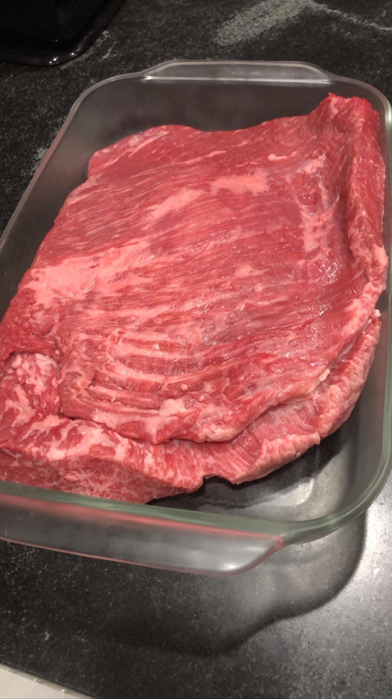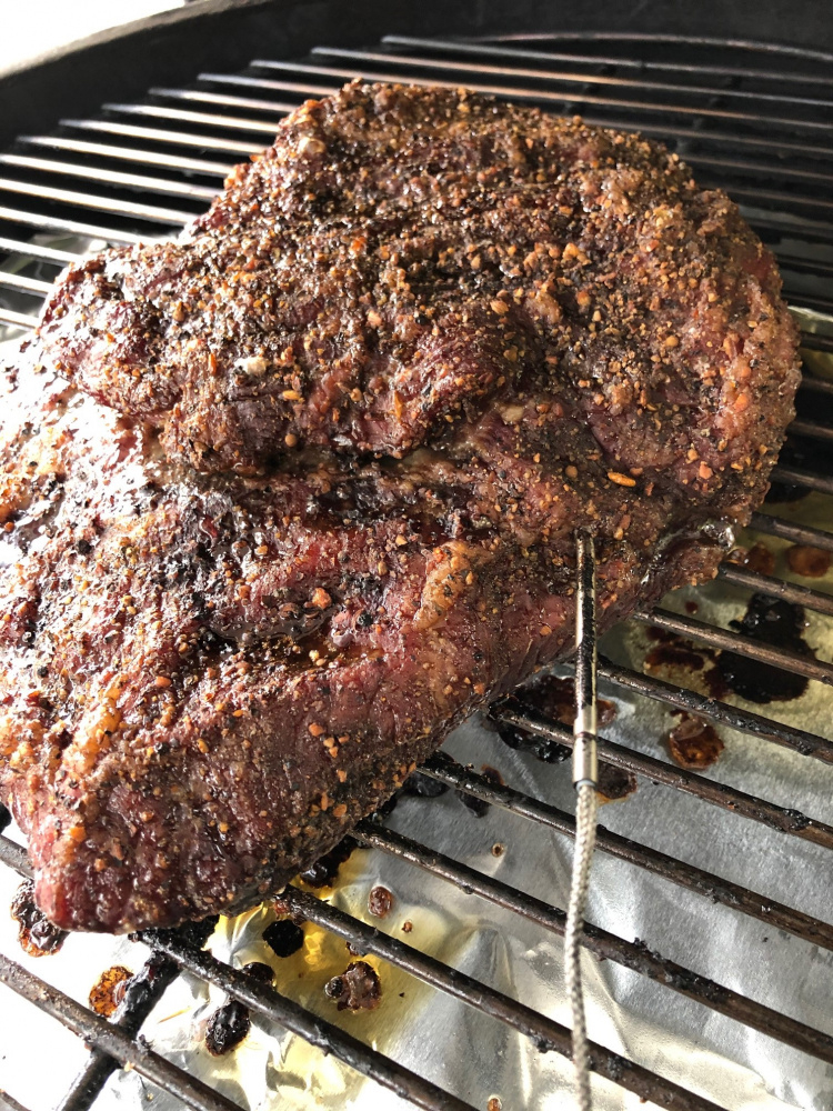 The XL is holding 225* pretty damn well! Trimmed it last night. Pulled it out of the fridge at 3 am, started up the egg, seasoned the brisket (by the way, Costco prime started at 9.27lb and trimmed off almost 3lbs of fat.) Let it sit. Egg came up to temp, added the plate setter and wood chunks. Let it go for some more time to stabilize and put the brisket on just after 4 am. Almost 10 hours in,,,,,Cow drives the cook.