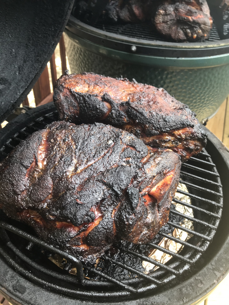 Well I just pulled the final piece off the egg. They all came off over the last 45min and with the exception of one part of one piece, they all were probing smooth like butter. After loading up the lump I ran it at about 375 for the rest of the cook. So now we wait and I'll try to remember to take some pics before it gets devoured.