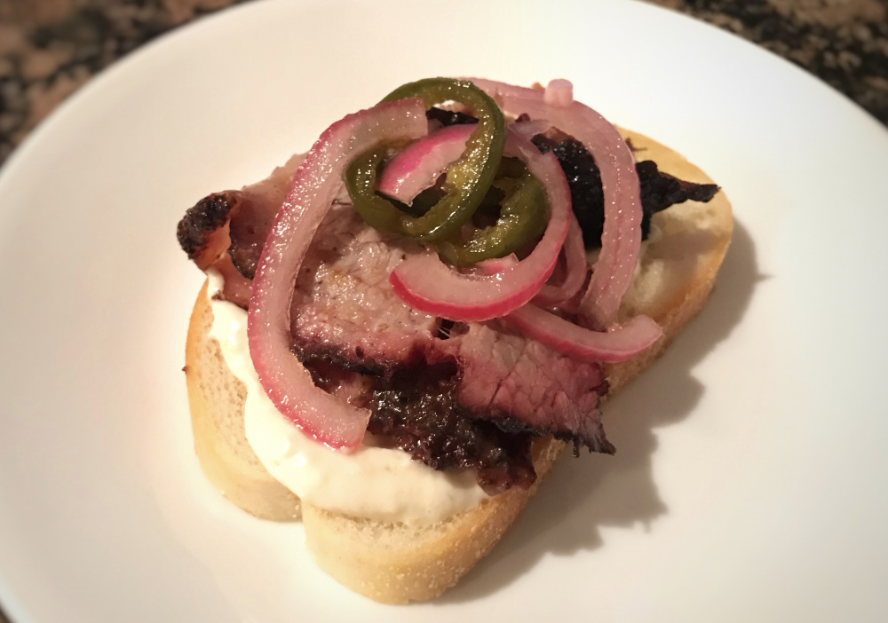Up first, we had a baguette that we toasted with butter and garlic salt. Then brushed on some horseradish mayo, followed by thinly sliced brisket point and spicy pickled onions.