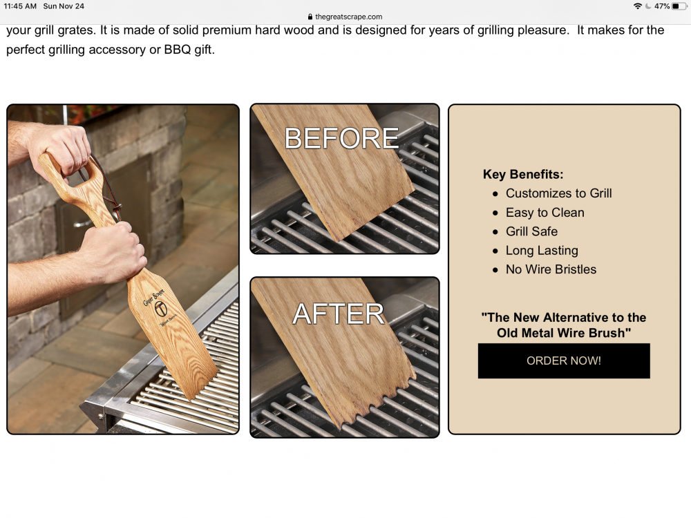Tried one like above, didn't clean very well. Tried a wood paddle, really did not like that. I went back to the dangerous grill brush. I just look at the grate before I put meat on. I also go with 'the grain' so I only have 1 cross bar to hit. I have yet to find a bristle come off. May use a ball of foil to follow up the brush.XL aka Senior, Mini Max aka Junior, Weber Q's, Blackstone 22, Lion built in, RecTec Mini 300, Lodge Hibachi, Uuni, wife says I have too many grills,,,,how many shoes do you have?