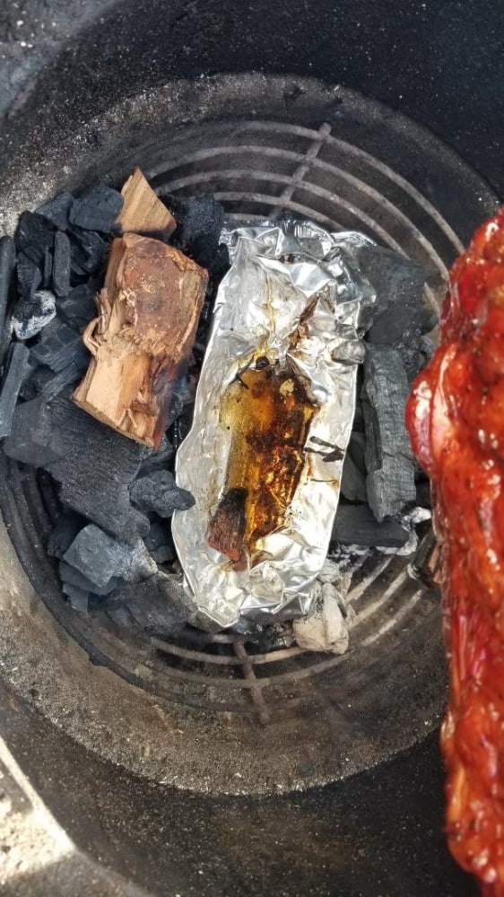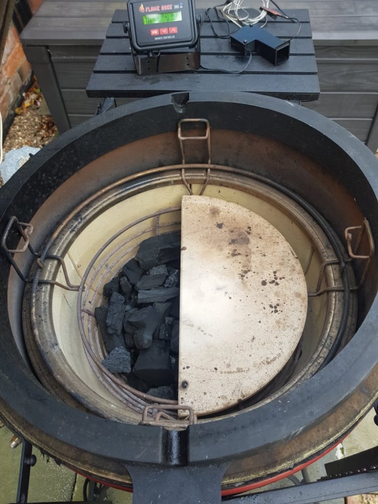 I ended up getting these little Mini Loaf Pans at the grocery store for $2. They catch the drippings and keep the charcoal to one side. I did not use a half moon deflector.XL BGE and Kamado Joe Jr. -