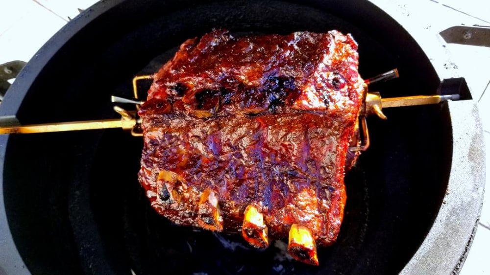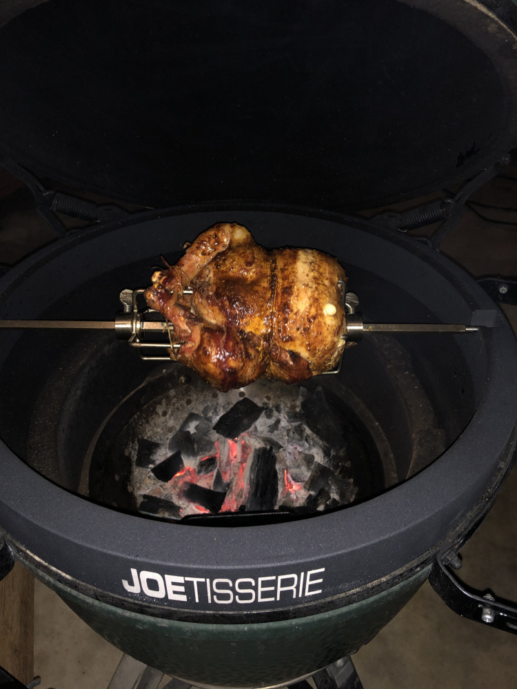 I came across this picture on another forum of someone using a half stone with the Joetissarie. They set the rotation direction so the grease rolls off on the stone side. This seems like a really good idea. My Joetissarie is arriving today and I was wondering if anyone else has tried this?