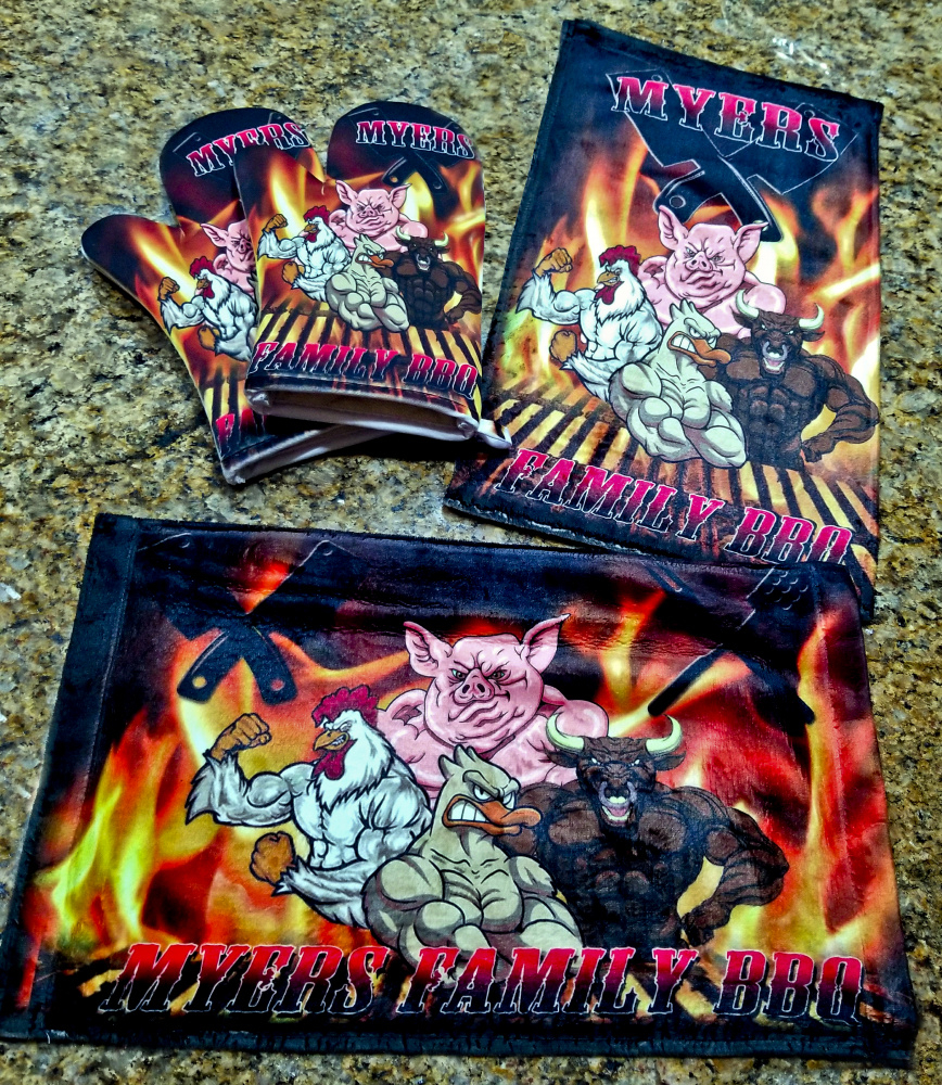 Well actually, i was perfecting the method of how to sublimate an image onto fabric and made some oven mits for someone. Then was goofing around a couple years ago when i made those towels to test colors and loss. The image stuck. Did all my own work. I dislike stick figures and what everyone else has. Now its a theme, all animals I grill.Columbus, Ohio