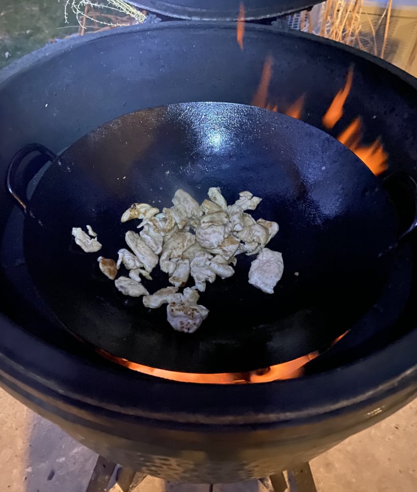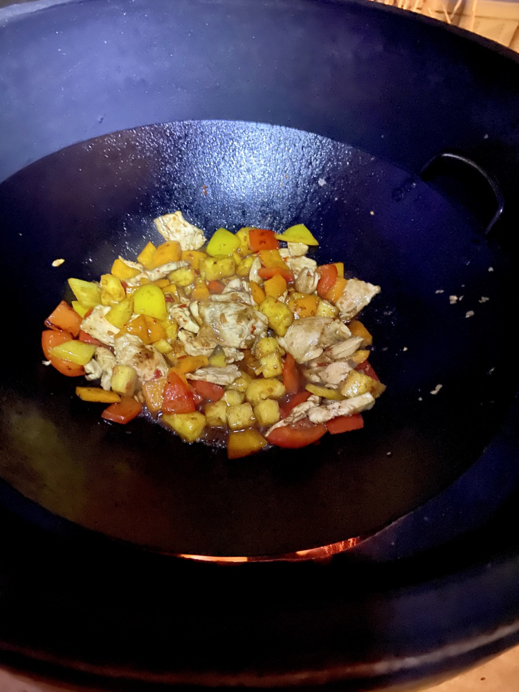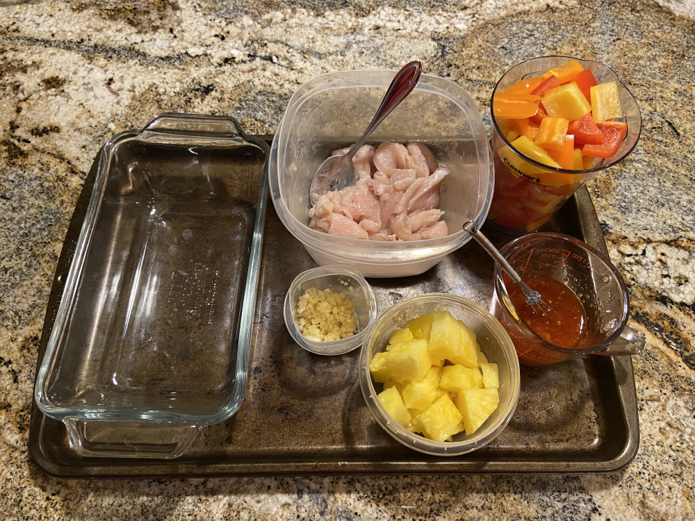 Seasoned the chicken with white pepper, fish sauce and rice flour.  Chopped peppers and fresh pineapple. Sauce was Sweet Chili sauce mixed with a touch of Sriracha