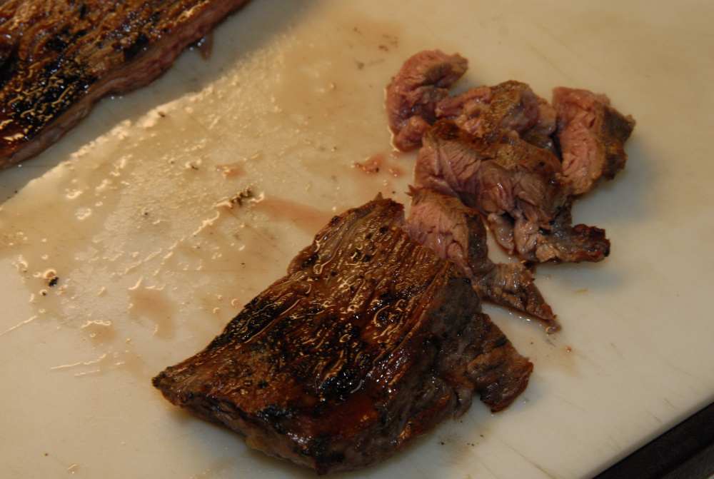 Decided to give this a try finally. Flank steak, sprinkled with lime juice, salt, and Dizzy's Red-Eye Express (coffee-based). Flipped 4 times, maybe 60 seconds per flip. Couldn't see any stuck embers or ash, so tented with foil for about 8 minutes, then sliced thin against the grain: