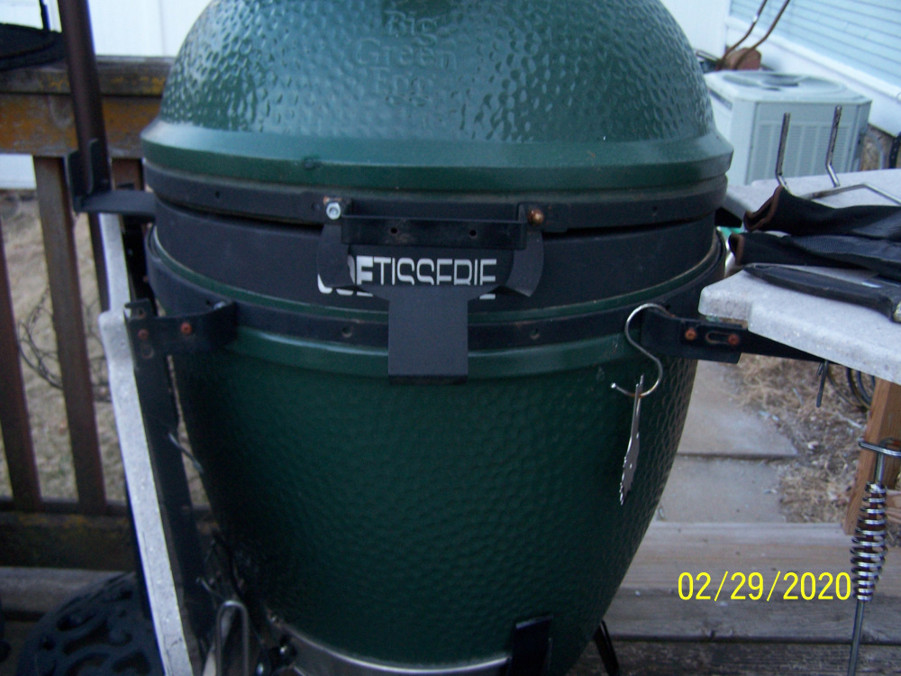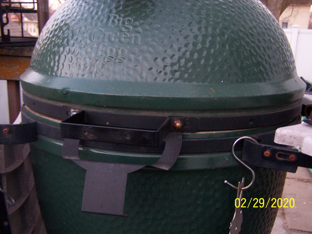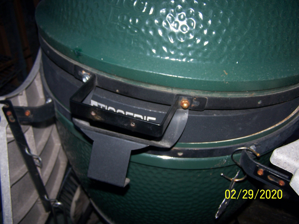 Yes, that bracket holds a grill lightcookingdude555 said:Your lower band is too low. I like to have it just below the felt. This allows you to "choke up" on the dome with the band, keeping it from looking like it is is going to let go of the dome when you open it. What is the metal piece below the handle? I dont have that on my eggs. Also, what is the tight fit, the fire ring, box, etc...