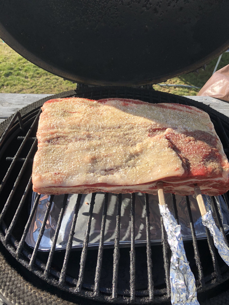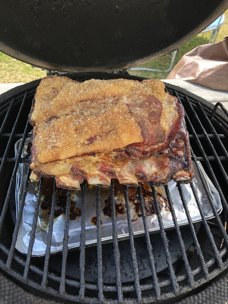 After studying beef ribs on the forum for a long time I finally decided to do a rack. 5.5 pound cut from Amish butcher. Egg set at 255-265. Dang thing was showing done, 195 degrees, after only 3 hours. It appears like there is too much fat, like a huge fat layer right in middle . It has risen like a damn soufflé . I flipped it over and will let it cook some more , tho I think it is a waste of time . I was limited on where I could get beef ribs around here, the Amish butcher was the only place I could find. Looks like I’m going to have to venture farther out. 1 Large Egg, Blackstone griddle