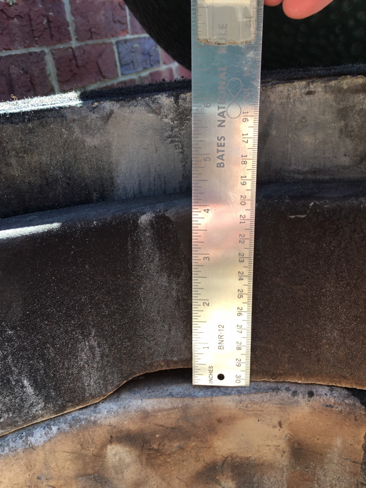 Just looked again at my plate setter and the legs are not modified or broken.The distance from the top of the fire box lowest section to the top edge of the lower egg bowl is 6.5". The distance from the top of the fire ring to the top edge of the lower bowl is 2.5" - this indicates the fire ring is 4" tall. My firebox lower section is 10" tall. Total from the bottom of the egg to the top of the lower egg bowl is 16.5". My top grill grate is 24" in diameter.Maybe someone with an XL egg can check their measurements to see the differences.
