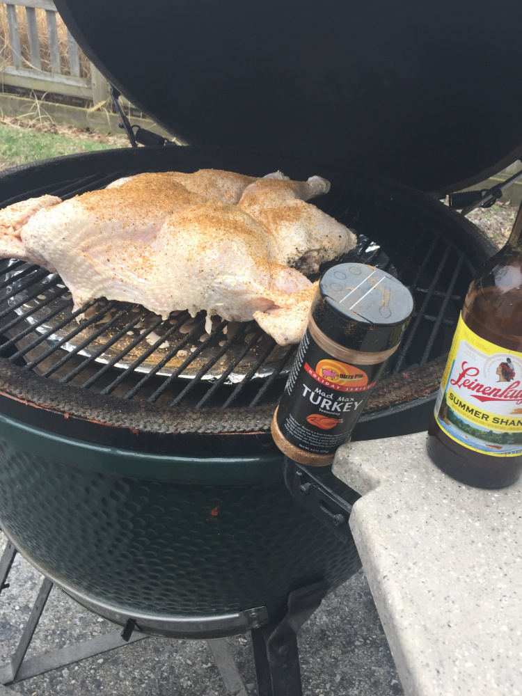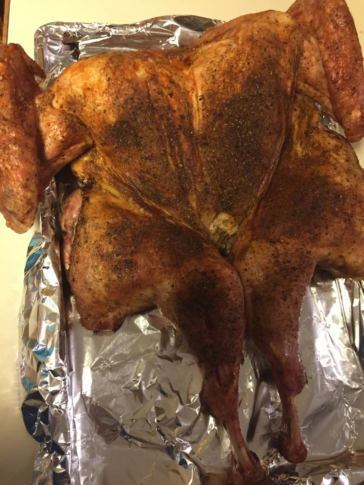 We raided the deep freeze and came up with a 13.25 pound turkey.  I spatchcocked it.  I didn’t brine it as planned because I was way too busy beating my family in Yahtzee, cards, Tumbling Dice and other games.  Ain’t quarantine wonderful?  Under the skin I loaded up the bird with a mixture of mayo & Mad Max
