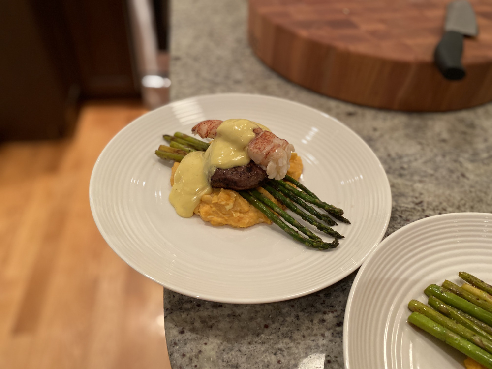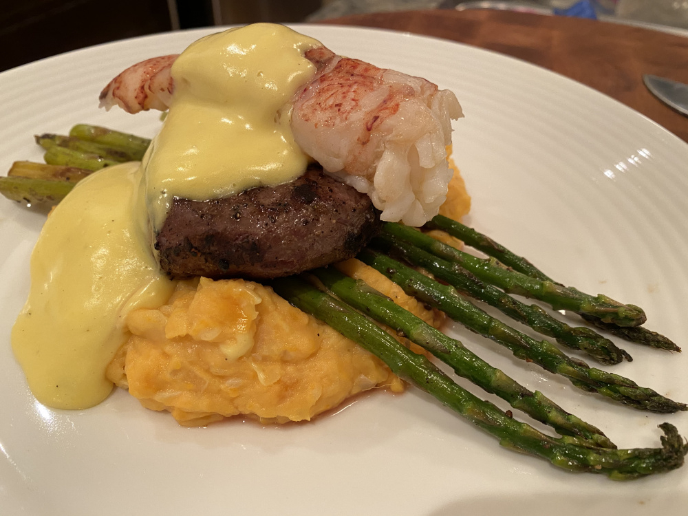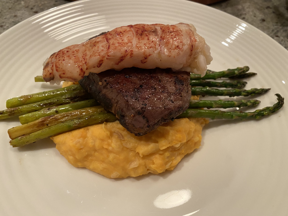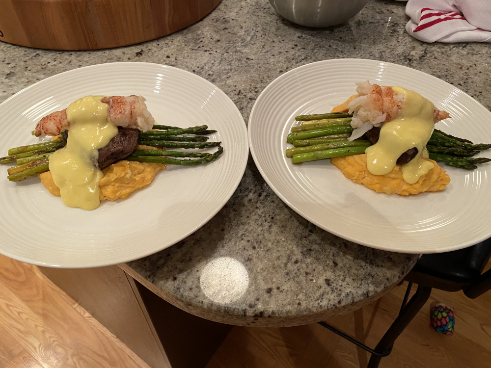 Decided to cook something a little special for my wife. Started with sous vide filet mignon. Added to that sous vide lobster tail poached in butter. Served on a bed of pan seared asparagus and sweet/russet mashed potatoes (mashed with fried onions and garlic) and topped with bearnaise sauce.