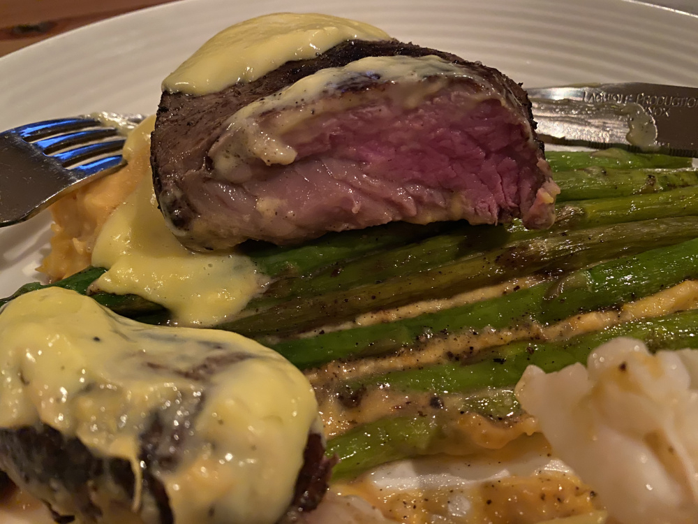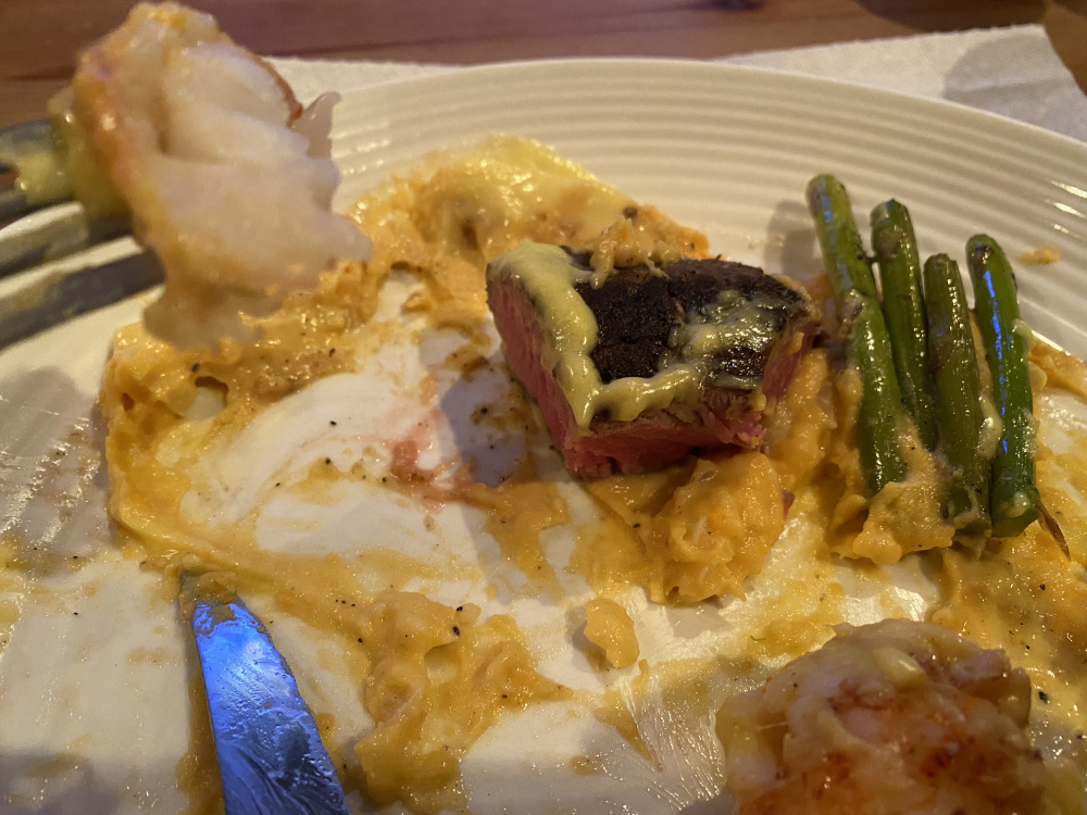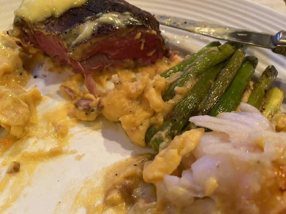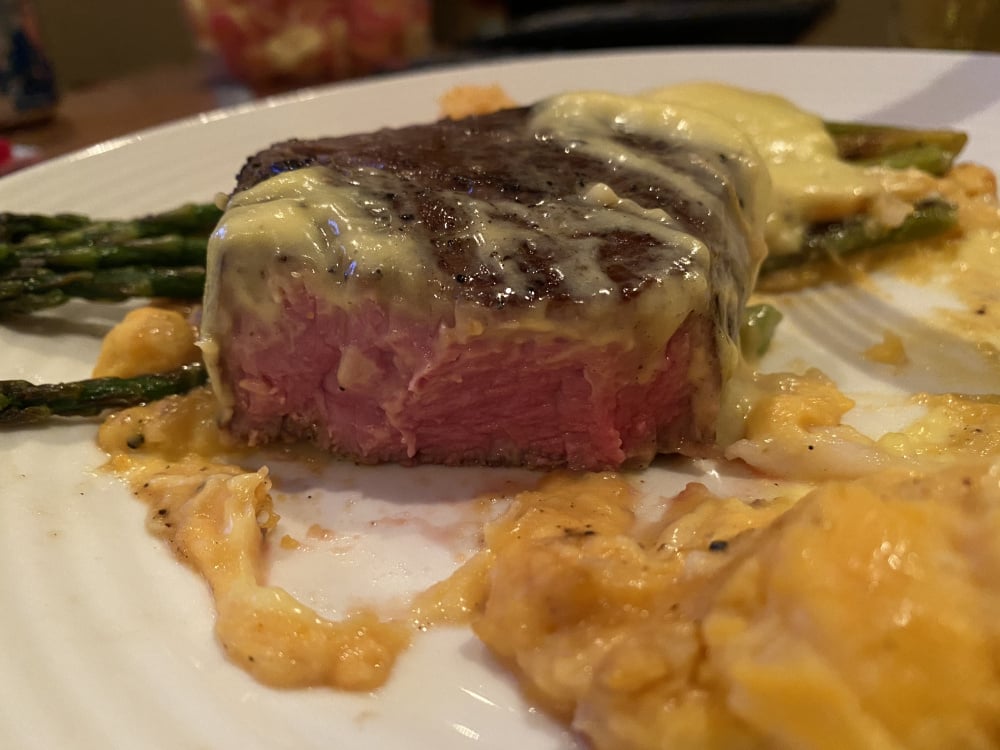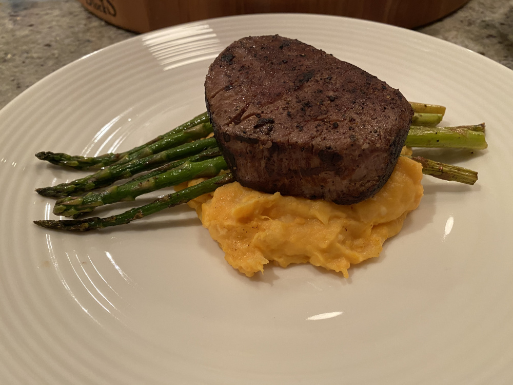 Decided to cook something a little special for my wife. Started with sous vide filet mignon. Added to that sous vide lobster tail poached in butter. Served on a bed of pan seared asparagus and sweet/russet mashed potatoes (mashed with fried onions and garlic) and topped with bearnaise sauce.