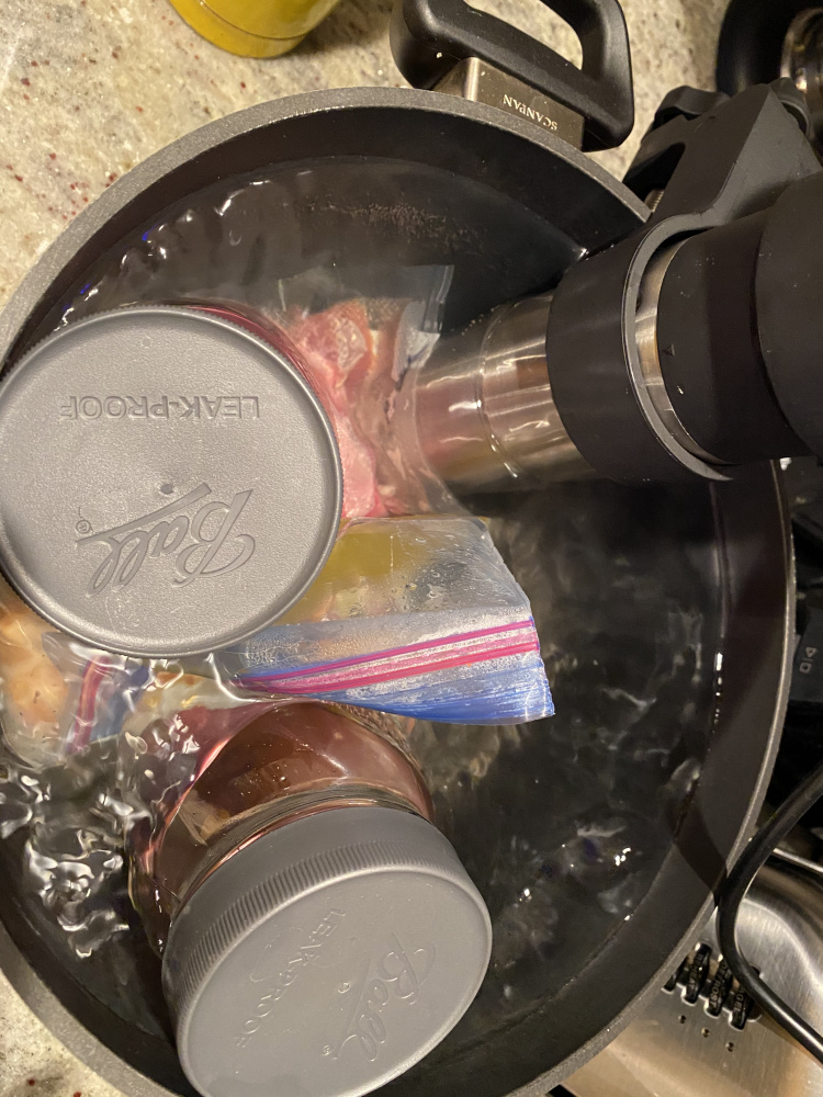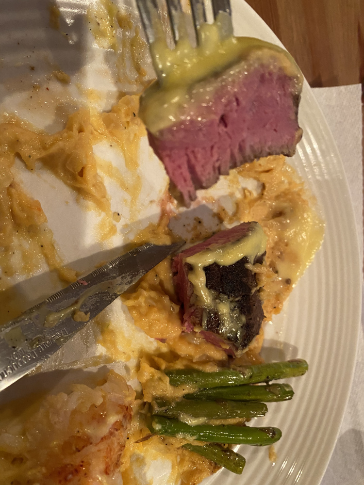 @caliking: The SV lobster was definitely a hit in my books. Dropped them naked into boiling water for one minute, followed by immediate submersion in an ice bath. Cut the shells away and then threw them into a Ziplock with butter and sous vided for about an hour at 127, which is where I also had the water for the steak. Very convenient to have the two proteins take a swim at the same temps, albeit for different durations. Very happy with how it all turned out. Doing the lobster this way was easy and made for very tender and not at all rubbery results. You’ll see that I tried to get a pic of the cross section of the lobster on the second to last results.