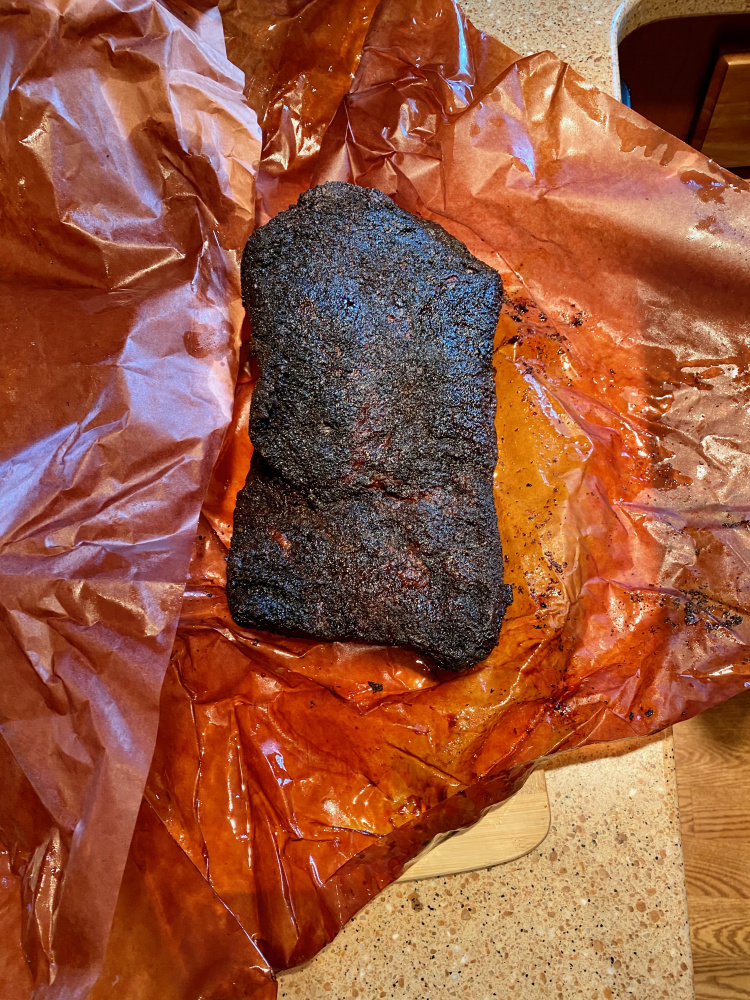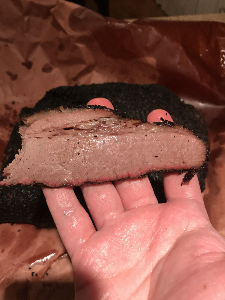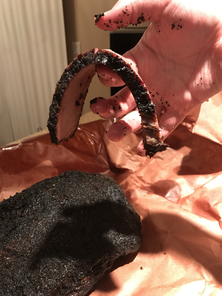 Had to run the one-year old to urgent care and pick up a prescription for an ear infection that was causing a fever. So ended up being much longer before initial slicing. Felt like either I pulled a little too early or it just cooled off a bit too much. Or I suppose I didn’t trim quite enough, as a little bit of fat didn’t quite render. Flat was juicy. Decent bend, and passsd the pull test, so it was close, but the point had a bit more solid fat than is preferred. Much less of a smoke ring than I usually see when I do beef ribs, but the particular aesthetic isn’t as vital to me. She looked beautiful when I unwrapped and bark was delightful.