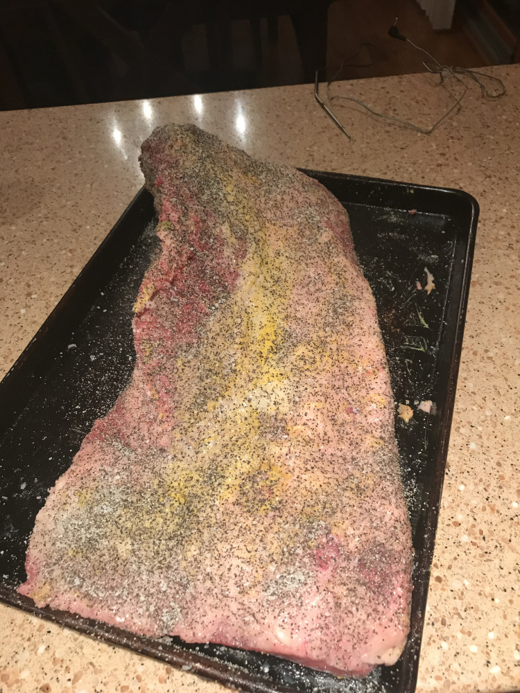 First, got up and did my best to trim up what was approximately a 14 pounder. There was a lot of very hard fat I had to excavate, as it felt to me like the type of fat that couldn't possible render out. I should have taken some pictures of it, but here is the rubbed slab before she went on. Just 50/50 course pepper and kosher salt.