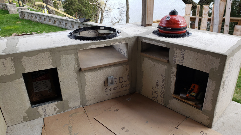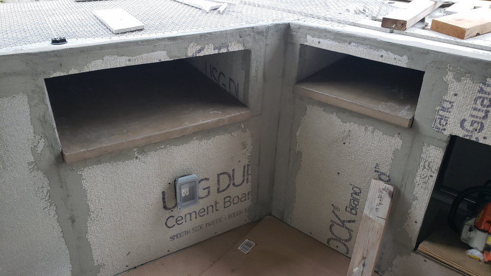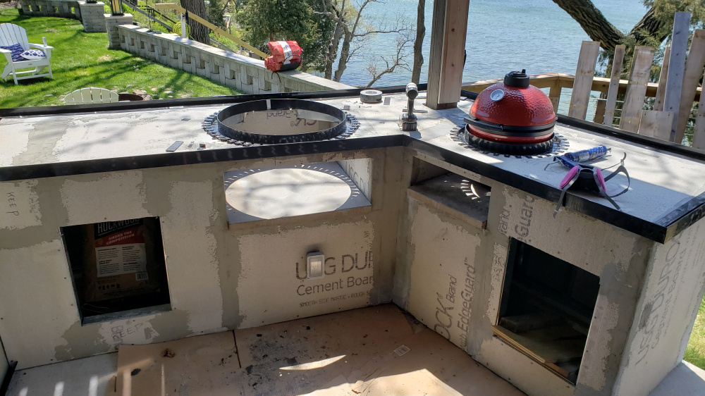 I can relate.  Pictured is black natural ledger stone.  Mine is just on top and accent and its ridiculously high priced as well as fragile when cutting.  Its chips so easily.  Im excited about your build.  Also love the egg circle rings.  Great idea.  Wish i would of thought of it.  I put a drawer under my egg.  The drawer width screwed me from enclosing the egg like you did.  Love that look.