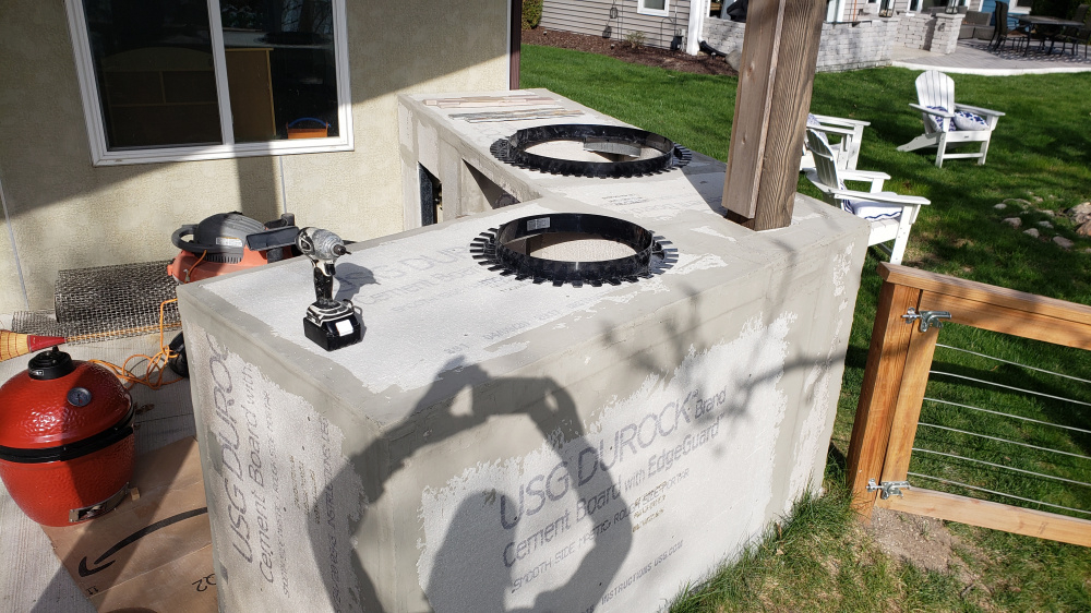 Installed the slabs. Now trying to figure out what size circles to cut in the cement board. I need a cloth tape measure.