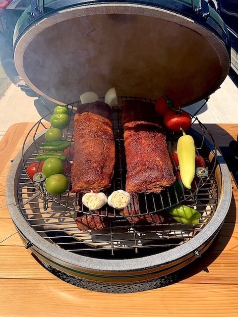 Anyhow, first cook to break her in was 4 rack of ribs and a bunch of veggies for salsa. Salsa was whip-ass, the ribs were a little dry to my taste but the fam and guests were stoked. We're always our own worst critic. Excuse the rigged up raised rack, Woo and AR w/ extra grates/stones along with KAB and bunch of other stuff will be here this week...as an aside, this is a crazy expensive hobby y'all lol. But I'm the type I can't own something like this and not buy all the cool toys to go with it. SMOBOT coming very soon, that thing is so cool.