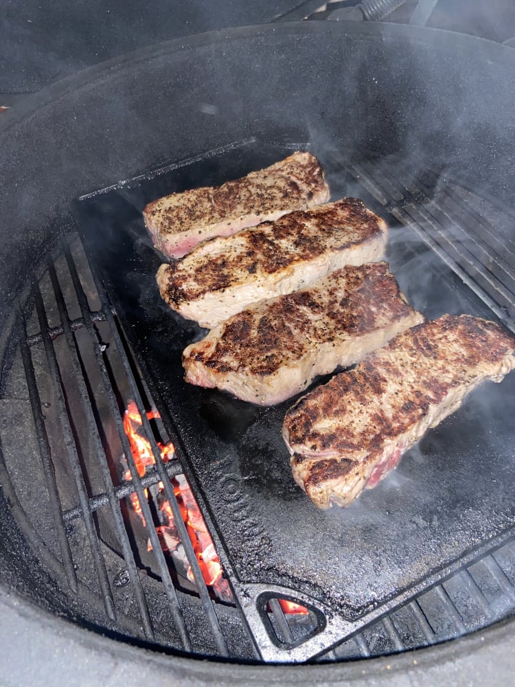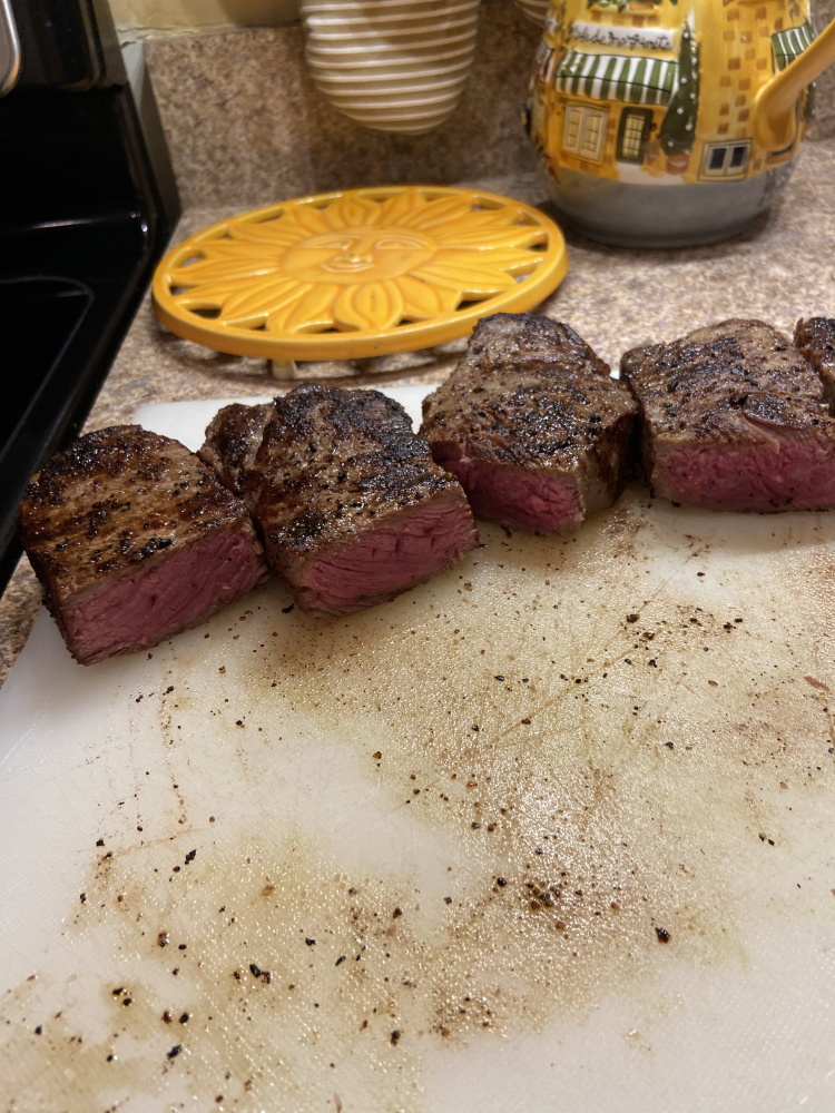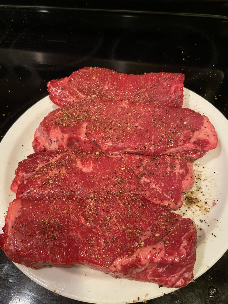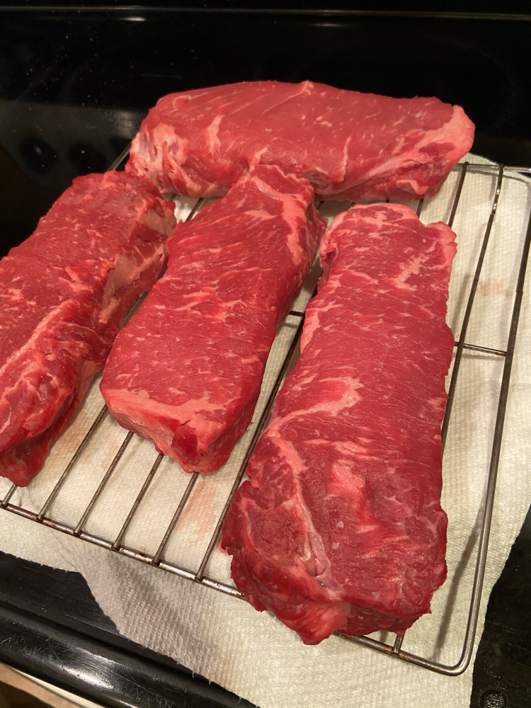 Picked-up a pack of center-cut NY strips from Wegman’s. As you can see, I trimmed pretty close - I find that outer band on strips to be pretty much inedible. Cut from the cryovac, I gave them 7 or 8 hours in the fridge to dry out. Gave them the lightest possible coat of olive oil, then generously dusted wth Suckle Busters Campfire Steak Seasoning. Dropped them on a CI griddle that was registering 730+ on the infrared thermo. 2 or 3 flips per side - edges were seared, too. Didn’t use a meat thermometer, just went by feel - I think I got it right.
