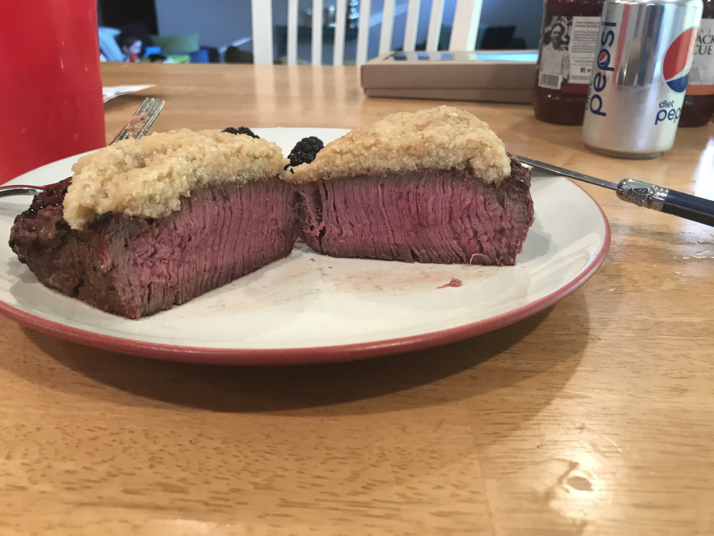 @caliking ratios are mostly to taste, for this cook I used 3/4 of a stick unsalted butter let it warm to room temp, put in a bowel, add quarter cup crispy panko, quarter cup parmesan cheese, splash of Worcestershire sauce, minced garlic 3 to 4 cloves - I mix just with my hand then split in half, lay then on cling on wrap and put in fridge till you’re ready. I cooked these steaks indirect at 300ish till about 105-110IT. Took them out got egg to about 520 seared 2min per side then moved them back to indirect and put the parmesan garlic butter on top for another 3 min with the air mostly shut down. Let me know if your try it!“There are three rules that I live by: never get less than twelve hours sleep; never play cards with a guy who has the same first name as a city; and never get involved with a woman with a tattoo of a dagger on her body.”