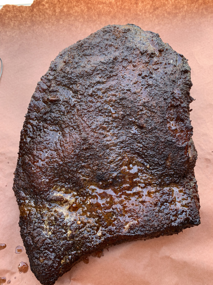 I put on a 14.4lb gold grade brisket this morning. I trimmed a little bit of the fat cap and seasoned with Clark company. Rolling right now at about 165 internal temperature. Question is should I wrap in butcher paper or just let it roll? Cooking at 250 dome temp.
