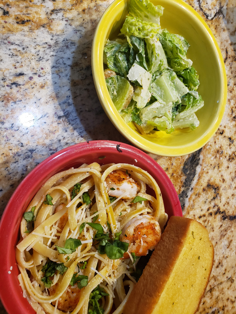 Added in the pasta and shrimp. Gave it a lit stir and plated up with some basil and a little more parmesan. Served with Kroger's finest Cesar salad mix and Texas Toast.